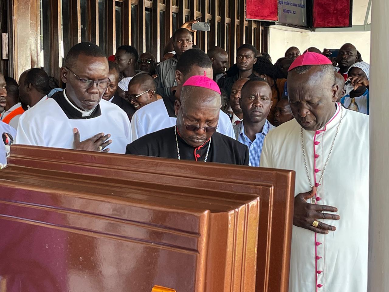 The body was escorted in a procession by priests and Catholic faithful to the church, where Bishop Kimengich presided over a three to four-hour mass.