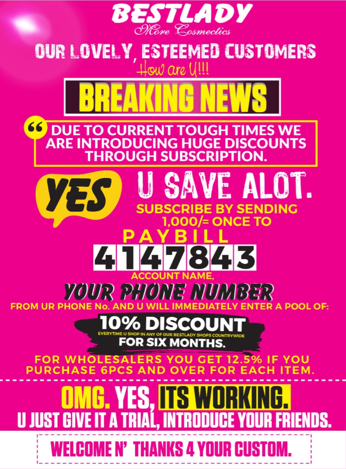 And what makes it even better? Renewal is easy. When your six months are up, simply renew your membership and keep the discounts coming. Shopping at Bestlady becomes something you look forward to, because every swipe of your till card or M-Pesa payment comes with instant satisfaction.