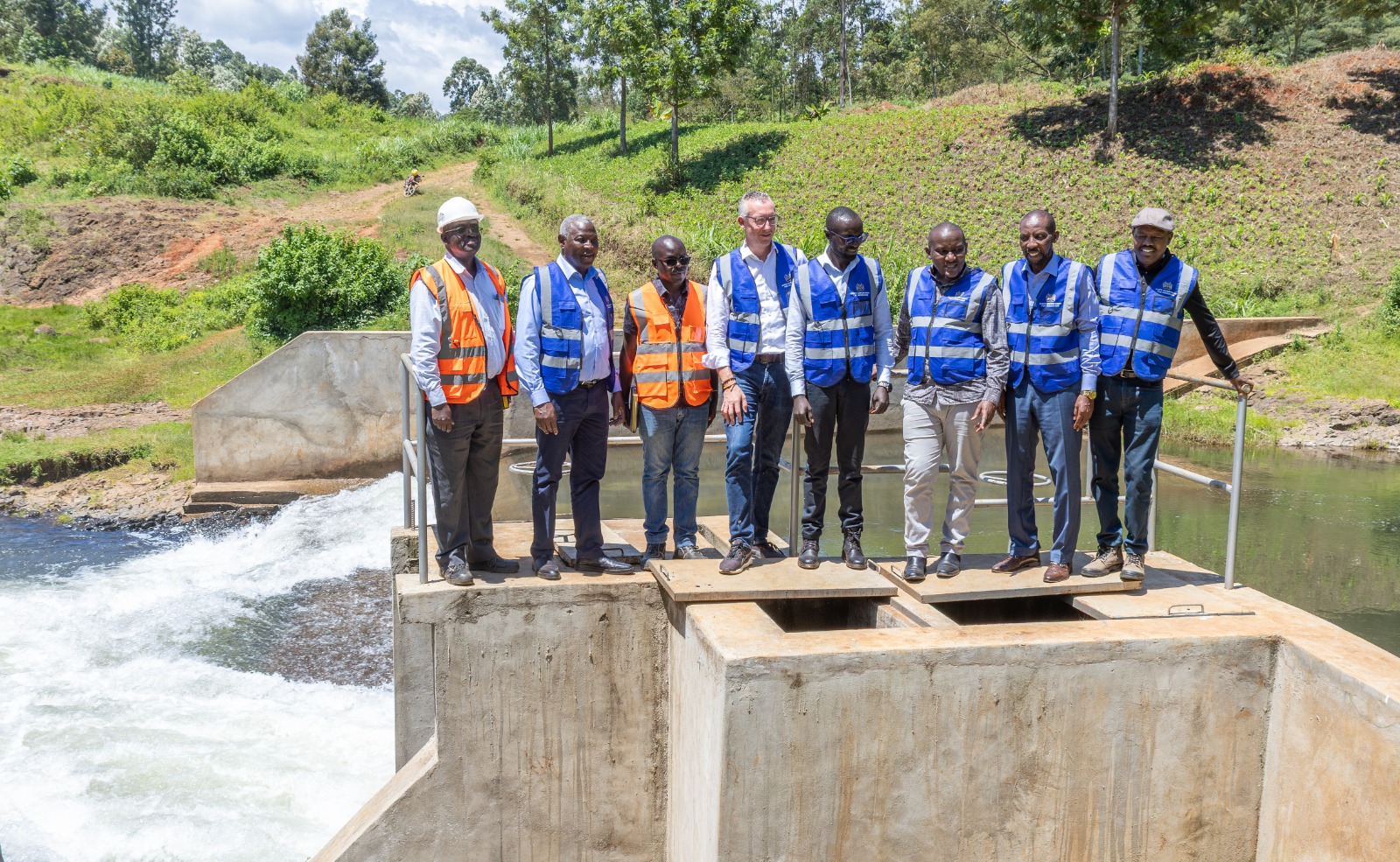 German ambassador to Kenya Sebastian Groth (forth left) and Water and Irrigation CS Eric Mugaa lead a delegation of officials on a visit of Kandeki water project intake along the Nyamindi river in Kirinyaga/ALICE WAITHERAThe farmer currently employs 10 people in his farm, helping to create jobs and strengthen the local economy.
