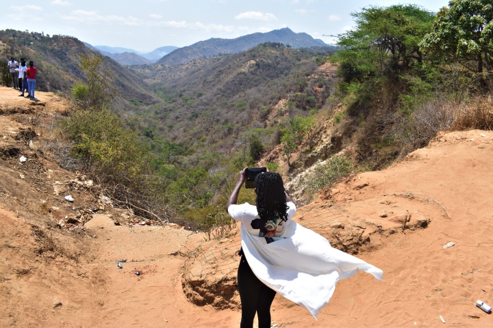 A journalist in Kitui County, Abigeal Musenya, in records the breathtaking and scenic Ikoo valley view on her smart phone during a visit last Friday/Musembi Nzengu.