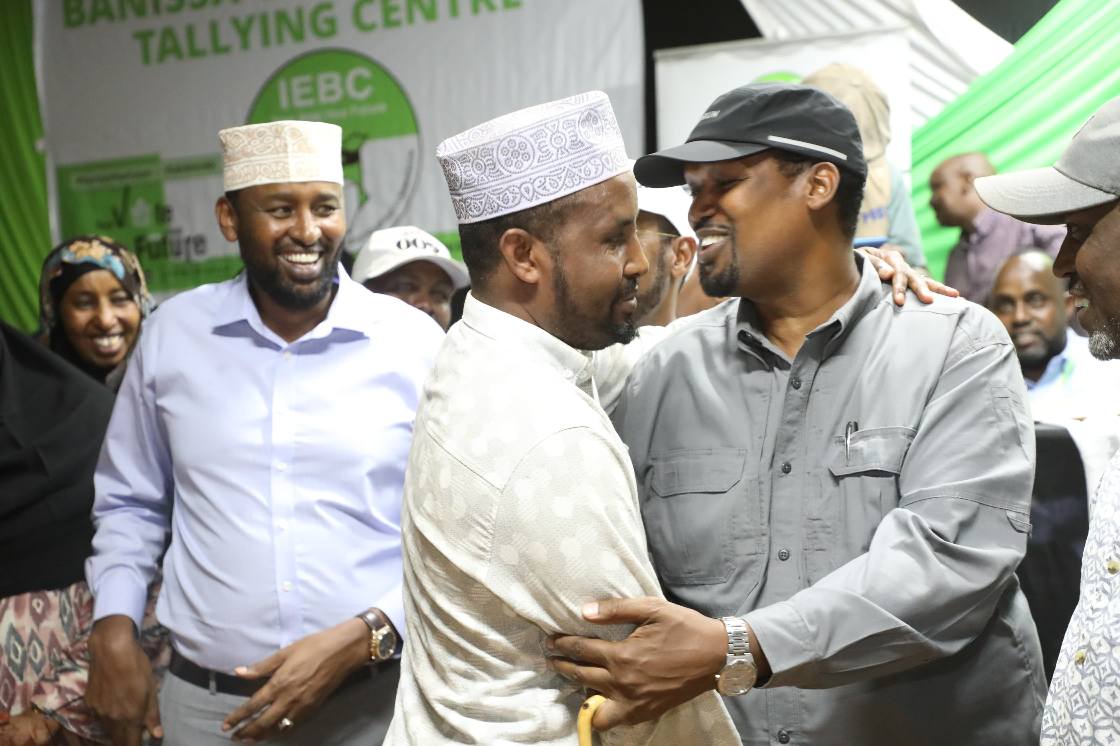 Newly elected Banisa MP Ahmed Maalim Hassan is congratulated by UPA candidate Nurdin Maalim Mohamed after being declared winner.