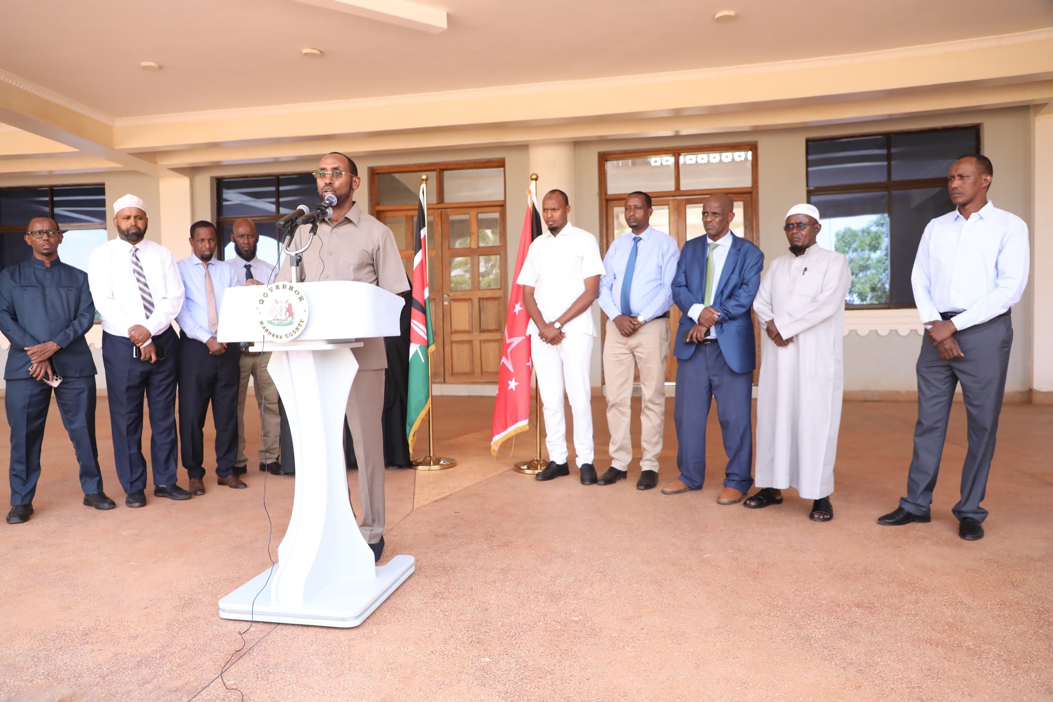Mandera Governor Mohamed Khalif speaking to the press
