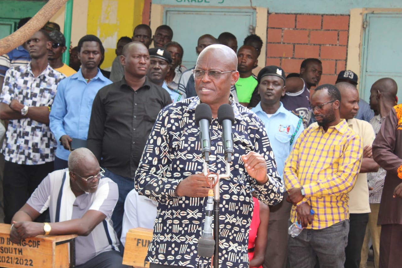 Governor Jeremiah Lomorukai addressing residents in Kaputir area where two police reservists were shot dead