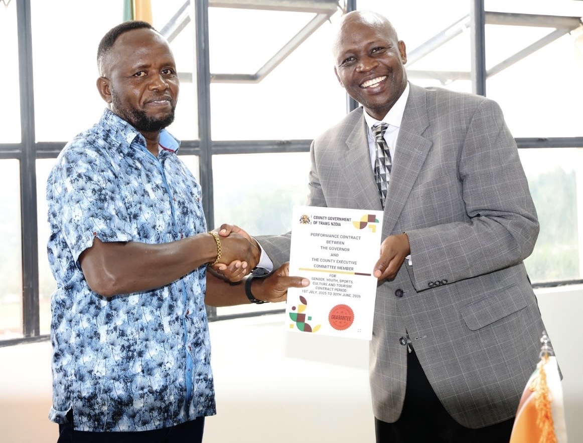 Trans Nzoia Governor George Natembeya receives signed performance contracting forms from gender executive Eliud Tormoi during the signing ceremony for county executives in Kitale/HANDOUTTrans Nzoia Governor George