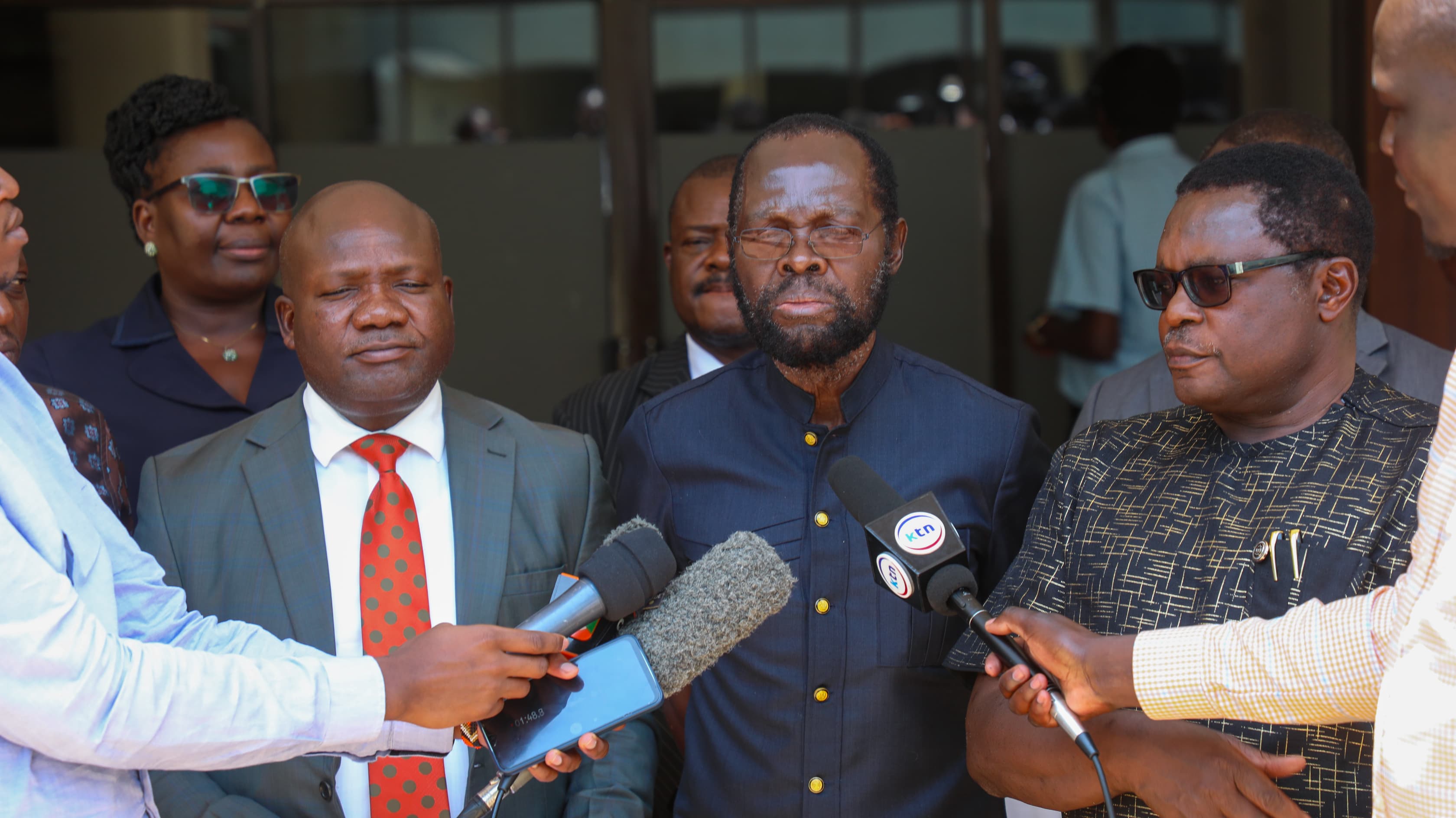 Governors Fernandes Barasa (Kakamega), Prof Anyang Nyong'o (Kisumu)and Kenneth Lusaka (Bungoma) during a presser outside tge Grand Royal Swess Hotel in Kisumu on Tuesday/IMAGE /HILTON OTENYO Kakamega county will host the inaugural Lake Region Economic Bloc (LREB) Climate Change summit. Kakamega Governor Fernandes