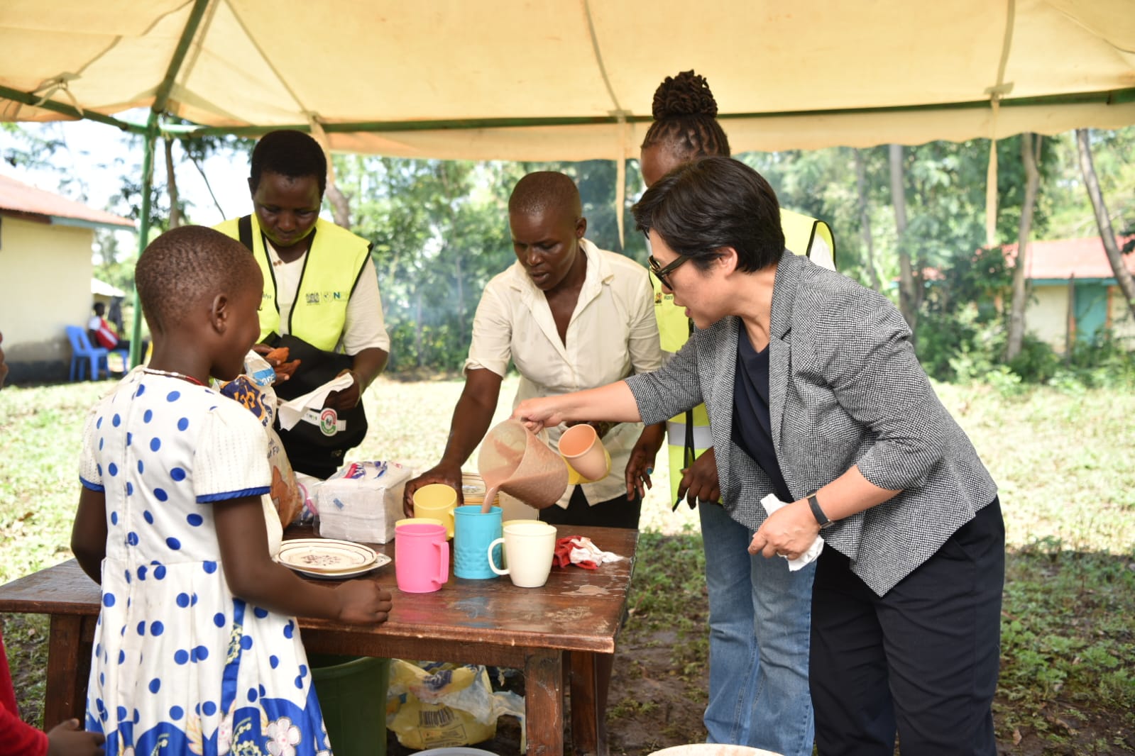 Hong Chow (right), a member of the healthcare executive committee and Head of China and International at Merck, assists health workers during the mass drug administration exercise.