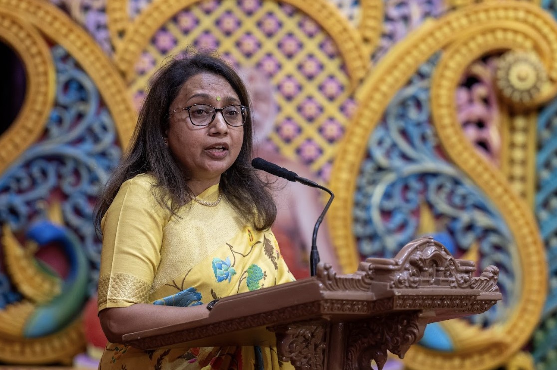 BAPS Women Wing Lead Dipa Gudka addressing the gathering. The celebration came a day after thousands of devotees on Sunday turned up at Jamhuri High School grounds for silver jubilee celebrations for the BAPS Shri Swaminarayan Mandir, Nairobi.