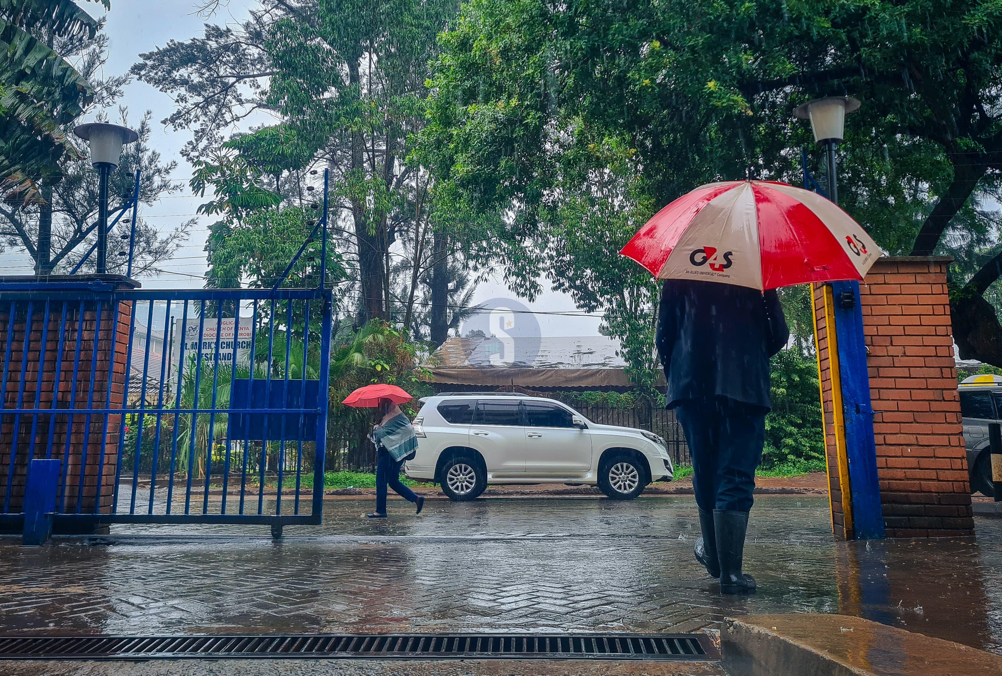 A security guard covers himself from the morning rains at Lions Place, Westlands, Nairobi on March 19, 2025/ VICTOR IMBOTO