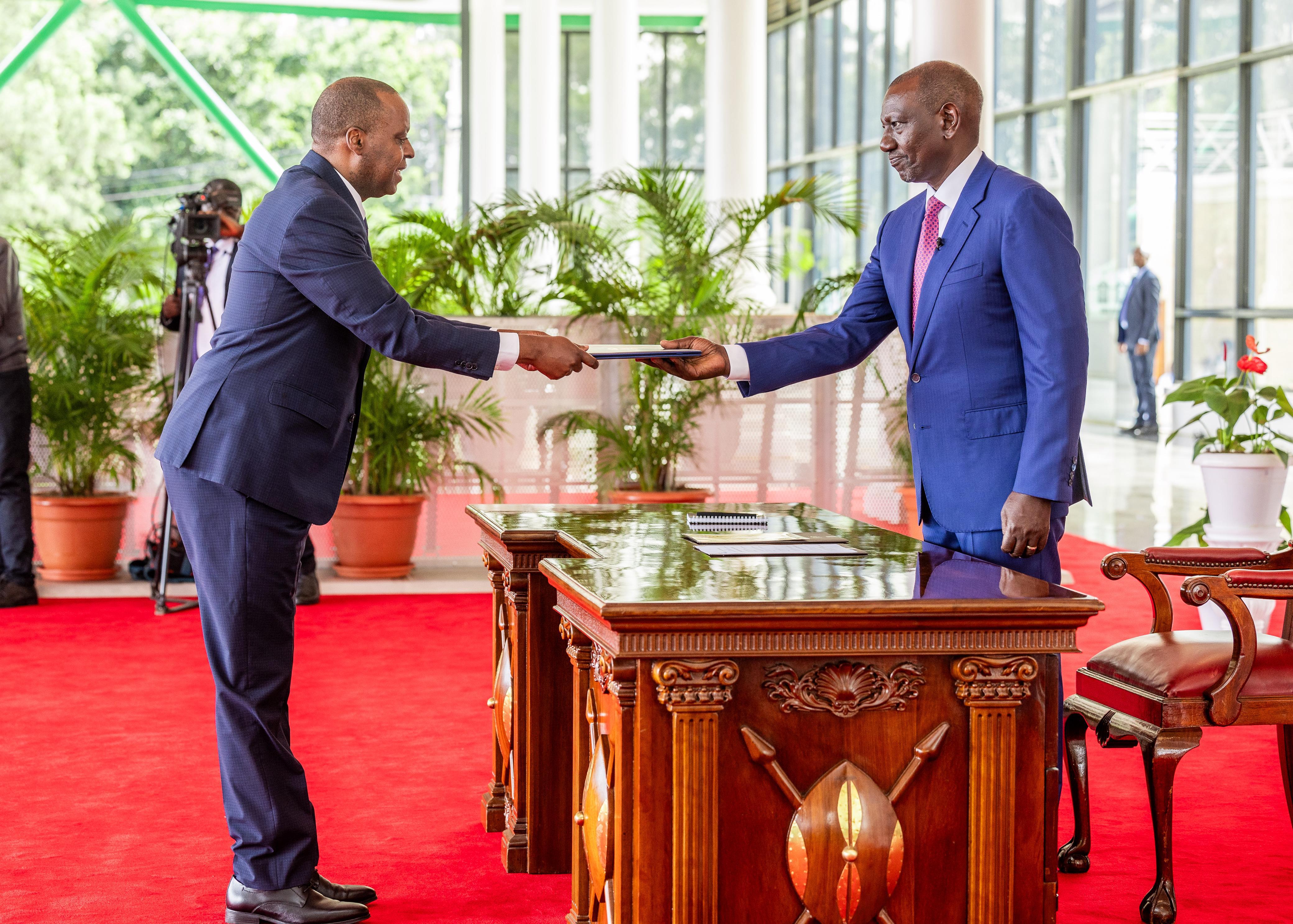 President William Ruto engaging with one of the newly appointed ambassadors during presentation of credentials at State House Nairobi County on June 4, 2025/ PCS