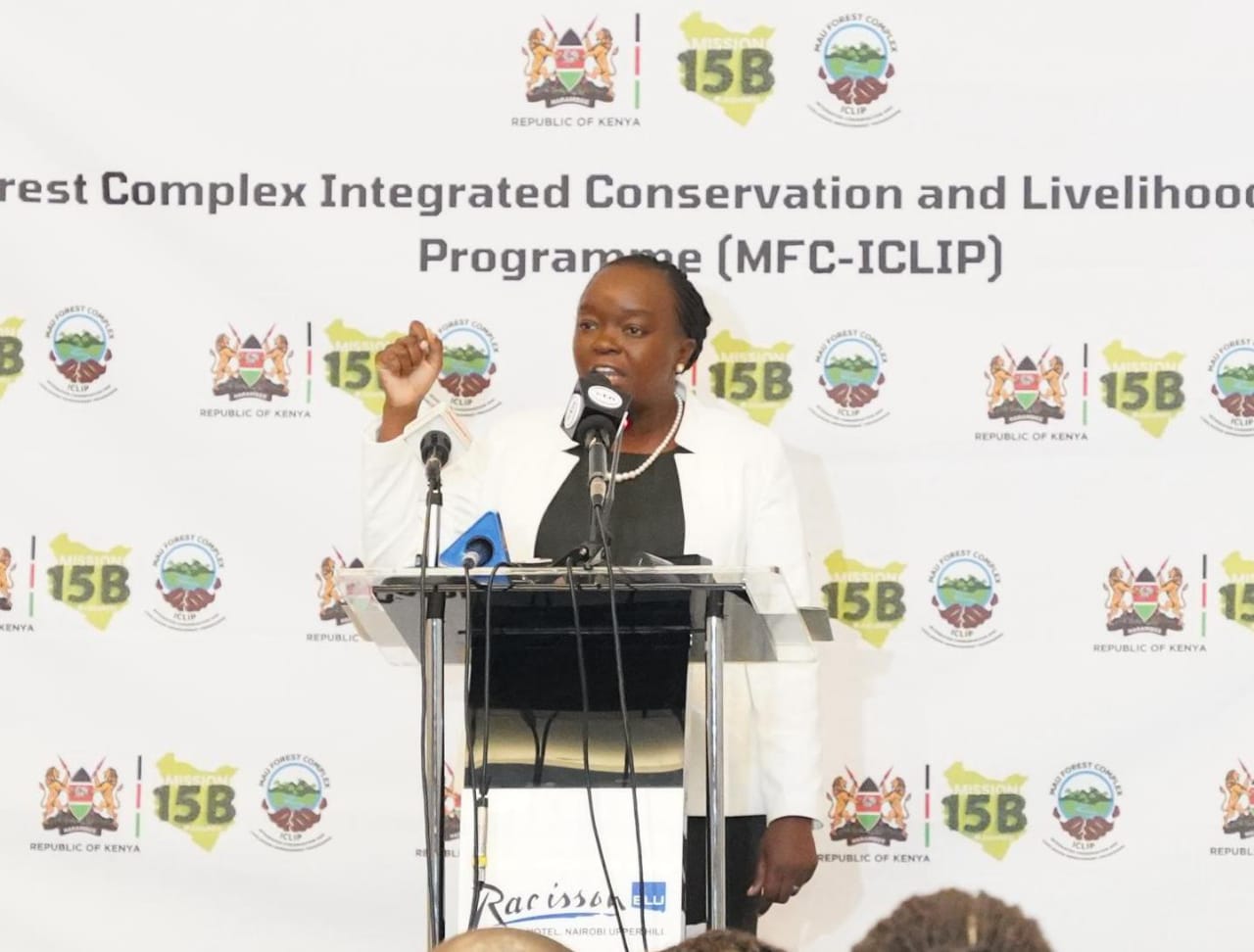 Environment, Climate Change and Forestry CS Deborah Barasa speaks during the launch of the 10-year Mau Forest restoration programme in Nairobi on Wednesday, September 17, 2025. /KNA