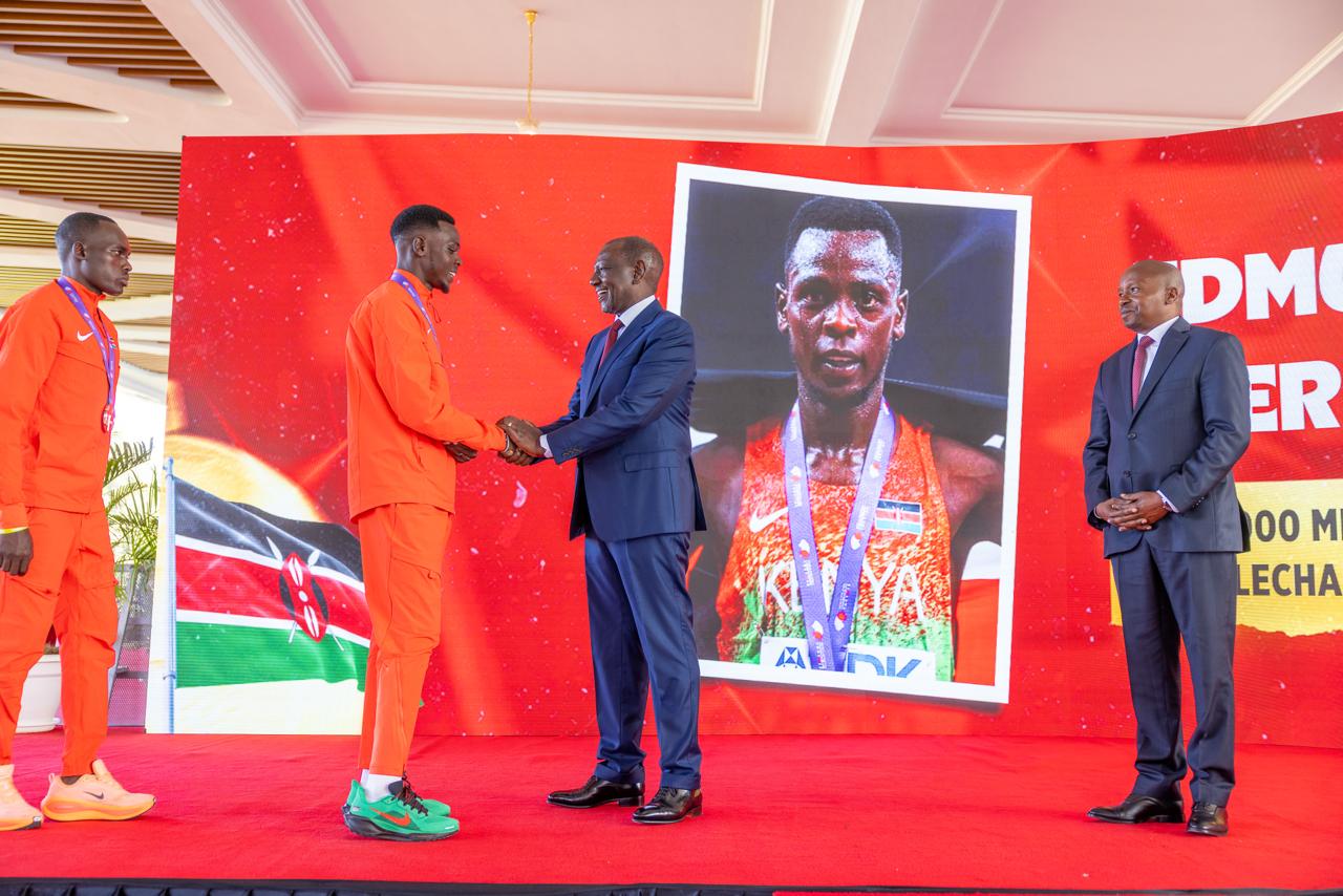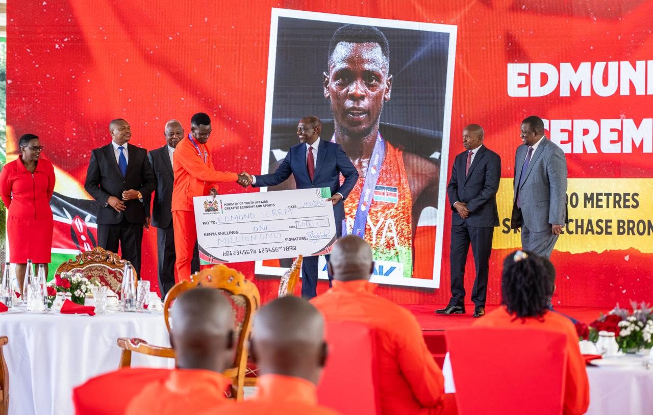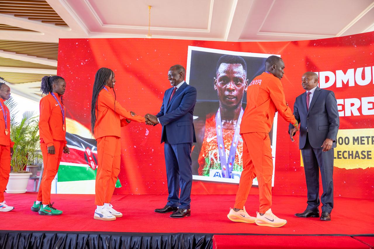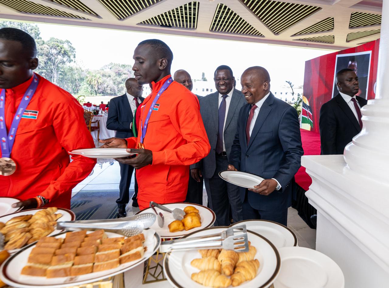 President William Ruto awards a dummy cheque to Edmund Serem at State House/PCSA section of the athletes during breakfast at the State House/PCSPresident William Ruto shakes hands with Julius Yego as DP Kithure Kindiki looks on/PCSPresident William Ruto shakes hands with an athlete/PCSPresident William Ruto and DP Kithure Kindiki with the Tokyo champions at State House/PCSTokyo Team Kenya, when they arrived at State House for breakfast/PCSFaith Kipyegon and Emmanuel Wanyonyi, with other athletes at State House on October 2, 2025/PCSFaith Kipyegon speaks during the event at State House on October 2, 2025/PCSPresident William Ruto joins other athletes in a breakfast State House/PCSDeputy President Kithure Kindiki joins the athletes in serving Breakfast at State House on October 2, 2025/PCSFaith Kipyegon, carrying the Kenyan flag, when they arrived at State House on October 2, 2025/PCSPresident William Ruto and DP Kithure Kindiki with the athletes at State House/PCSSports Cabinet Secretary Salim Mvurya speaks during the event/PCS