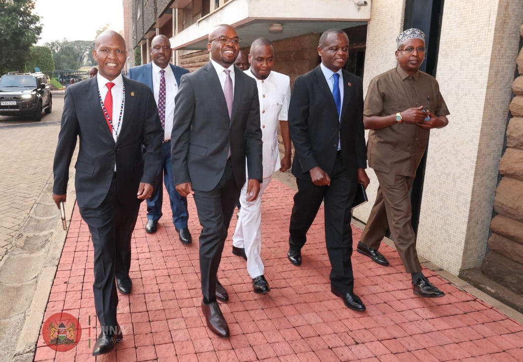 Interior Principal Secretary Raymond Omollo (second left) arrives for the Jukwaa la Wasomi forum held at the University of Nairobi/HANDOUT