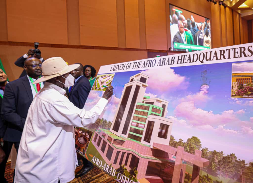 Uganda President Yoweri Museveni indels his signature on the model Afro Arab headquarters during the Afro-Arab Youth Congress in Kampala, Uganda, October 10, 2025. /DPCS