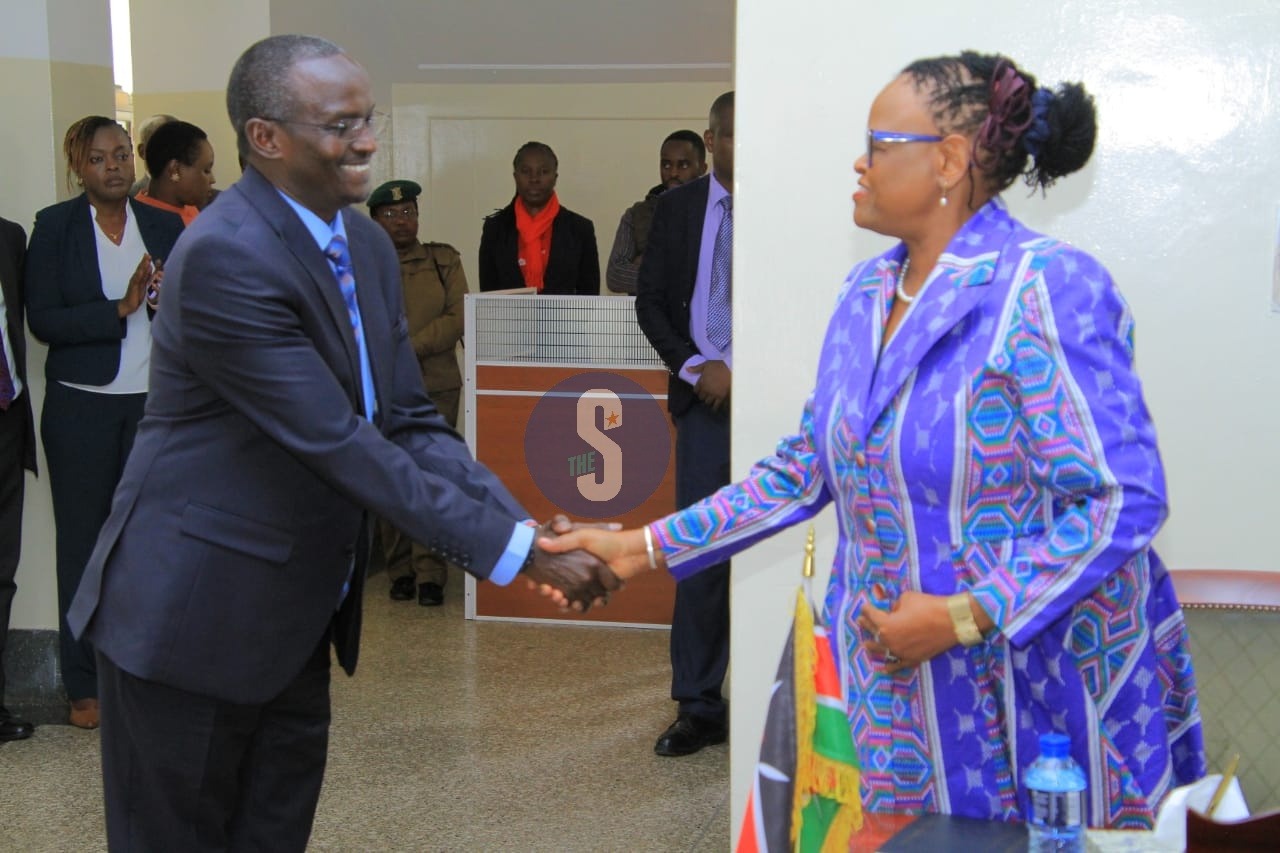 Cox Lorionokou greets Chief Justice Martha Koome ahead of taking oath of office at the Supreme Court of Kenya on October