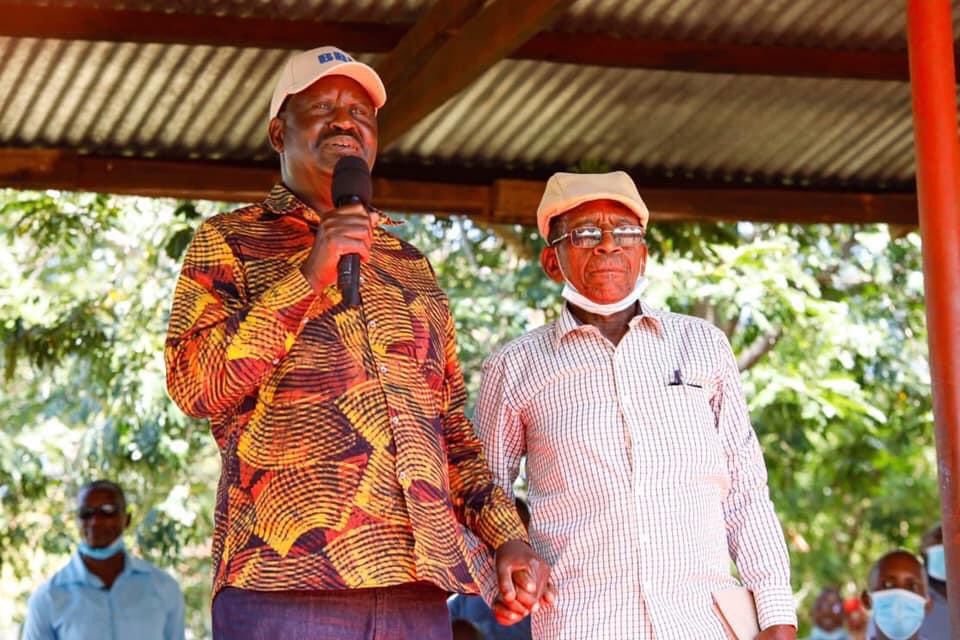 Former Prime Minister Raila Odinga with Mzee John Mwavuda, his former prison guard during his detention period in Manyani maximum prison on March 2, 2021/RAILA ODINGA/X