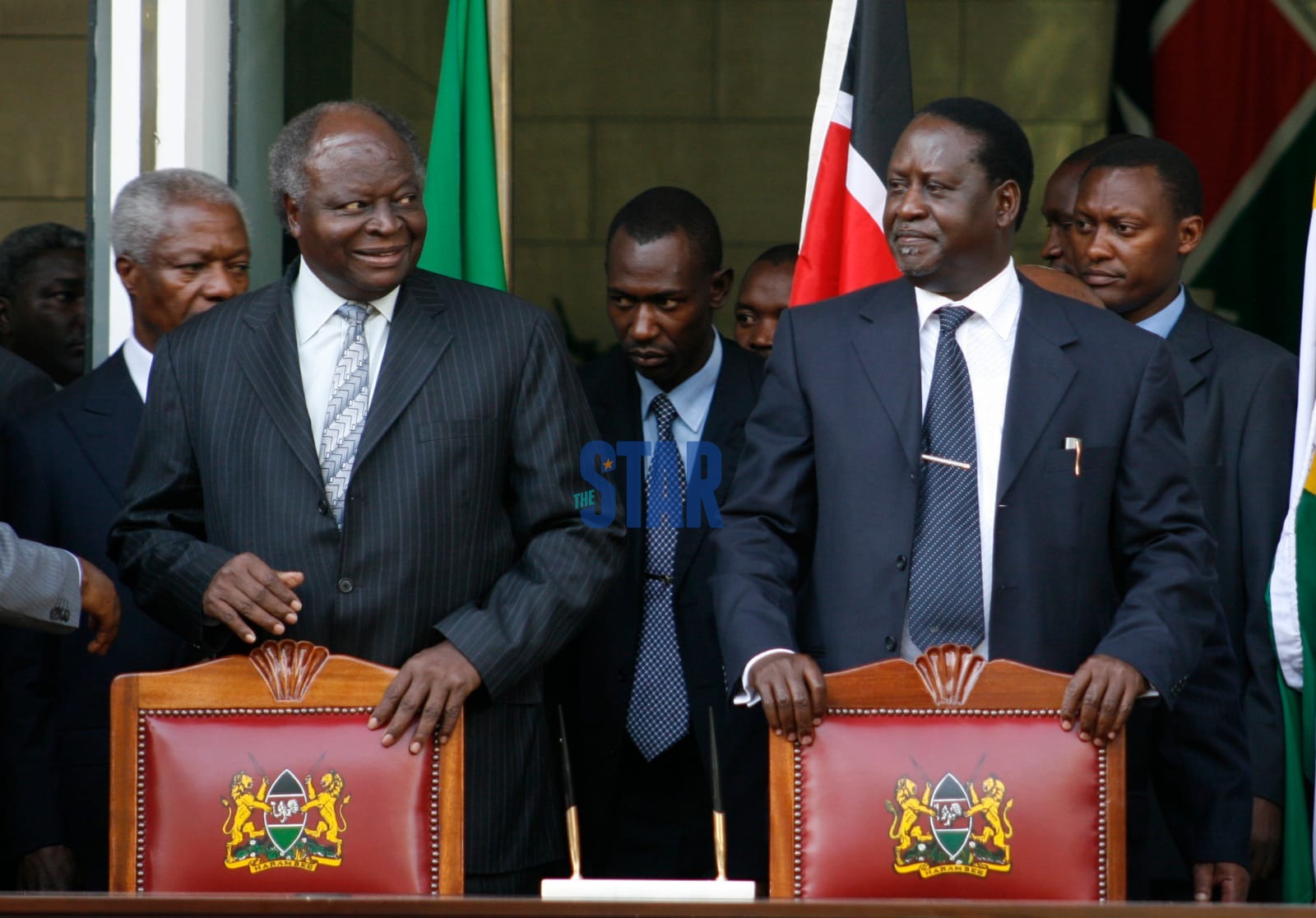 late President Mwai Kibaki and the late ODM leader Raila Odinga during the peace