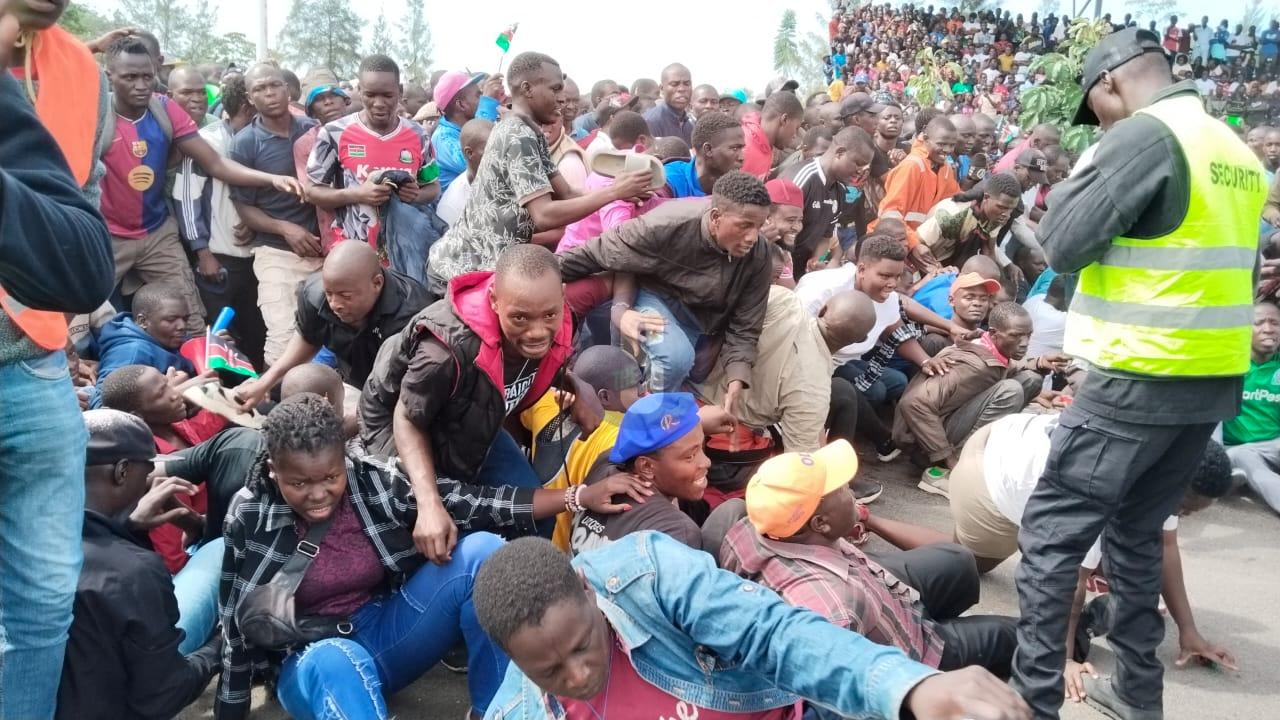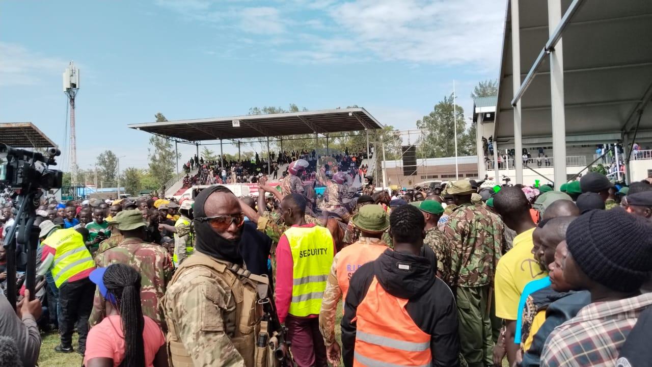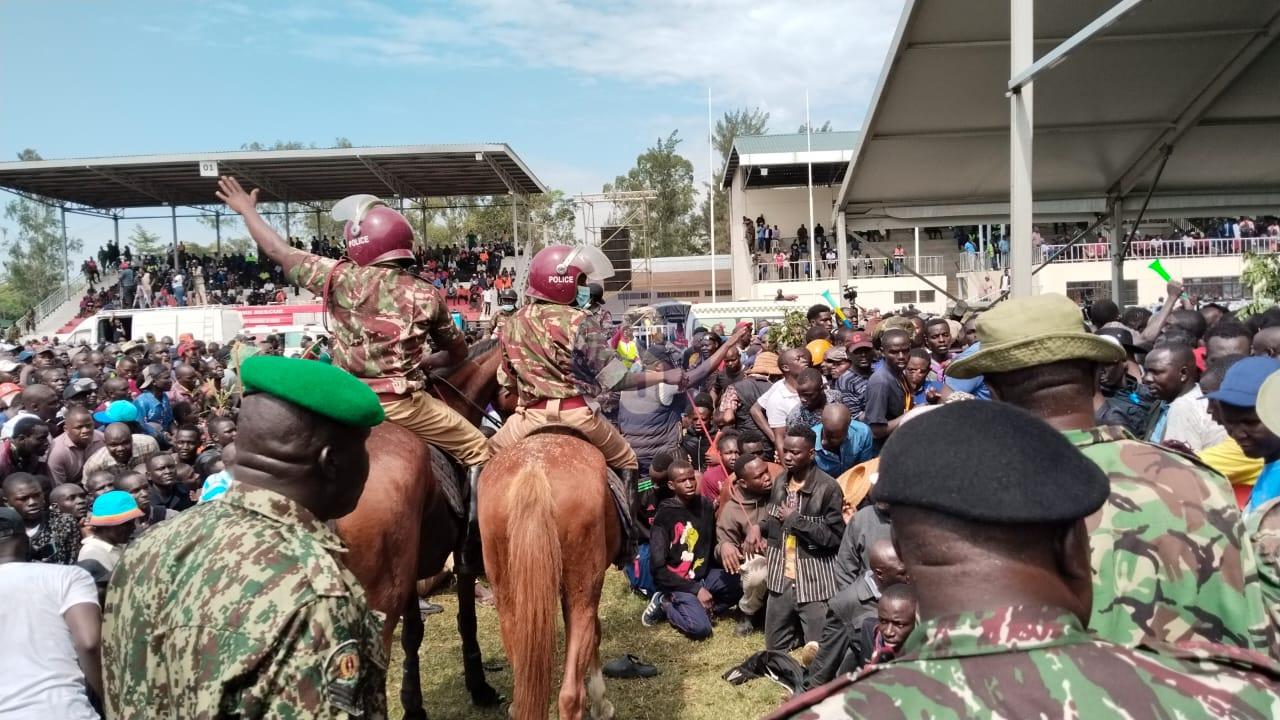 Police officers had a difficult time controlling the massive crowd that turned up at the Jomo Kenyatta International Stadium in Mamboleo, Kisumu, to view the body of the late Raila Odinga.