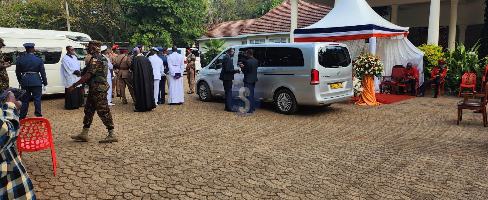 The family members, church leaders, and top military personnel are ready for the procession. They are waiting for the body to be onboarded on the military vehicle carrier to be ferried by road from Opoda Farm to the university, where the service will be held.