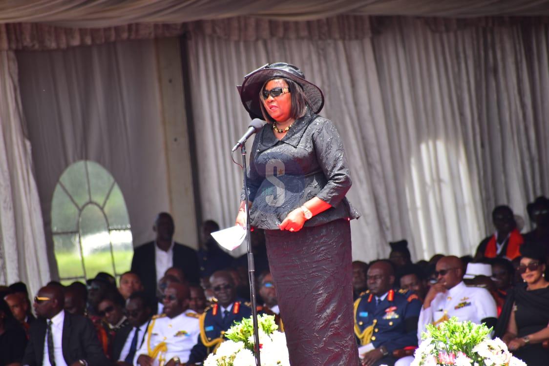 Former Prime Minister Raila Odinga's wife, Ida, speaking during the funeral in Bondo on october 19, 2025./MAURICE ALAL