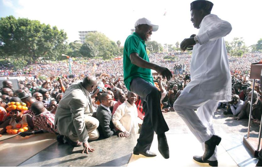 Raila Odinga enjoys a jig with Kakamega Senator Boni Khalwale during a rally at Uhuru Park in Nairobi on June 1, 2016 /FILE