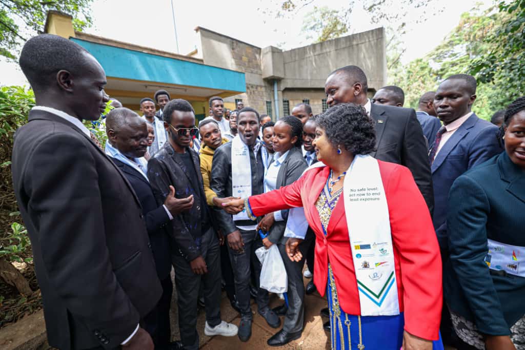 Deputy President Kithure Kindiki's spouse Joyce Kithure is welcomed by students at the University of Nairobi, Chiromo Campus for the 13th International Lead Poisoning Prevention Week of Action on October 24, 2025. /DPCS