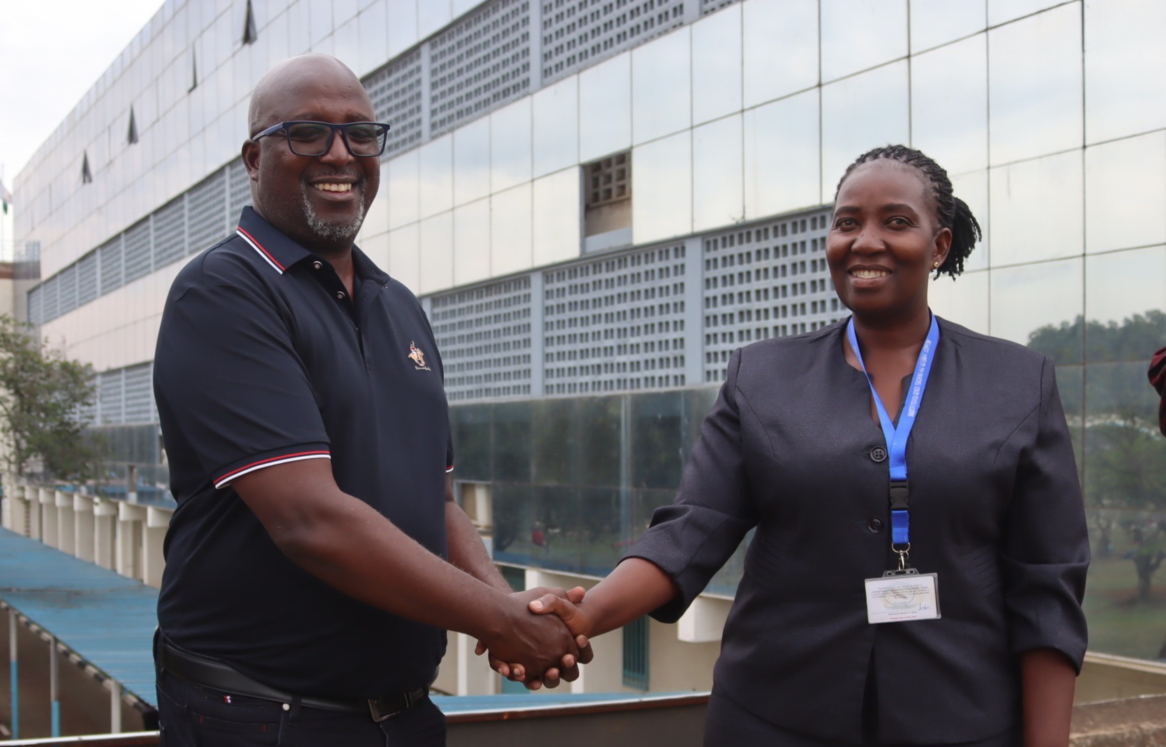JKUAT's Prof Simon Karanja and JOOTRH Director of Nursing Teresa Okiri pose for a photo at the facility on Thursday October 23, 2025. /KNA