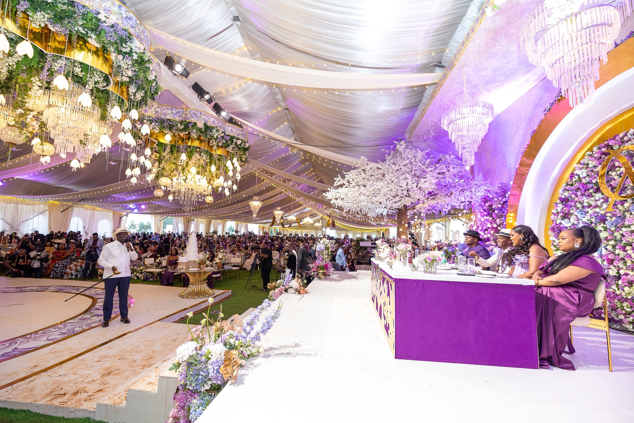 The groom stunned in a purple and white outfit, while the bride dazzled in a purple corset dress.