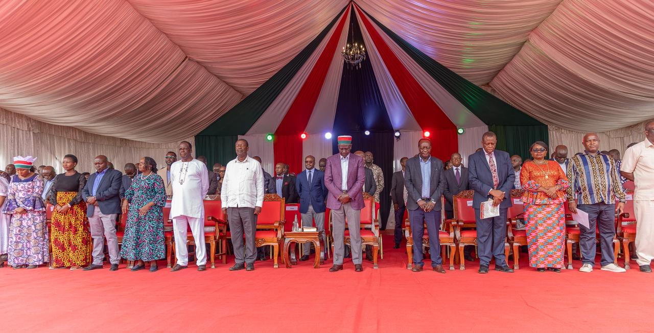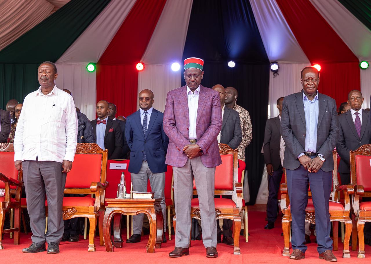 CS Wycliffe Oparanya, PCS Musalia Mudavadi, PS Raymond Omollo and President William Ruto during the church service at the African Divine Church, Gamalenga, Vihiga county on November 2, 2025/PCS