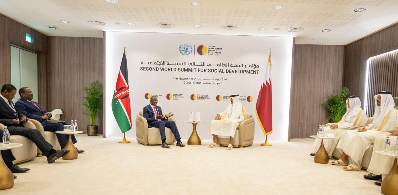 President William Ruto holds talks with His Highness Sheikh Tamim bin Hamad Al Thani, the Emir of Qatar, in Doha, on the sidelines of the Second World Summit for Social Development, November 4, 2025. /PCSKenya and Qatar have agreed to expand their partnership through new investments in key sectors, including agriculture, infrastructure and finance.