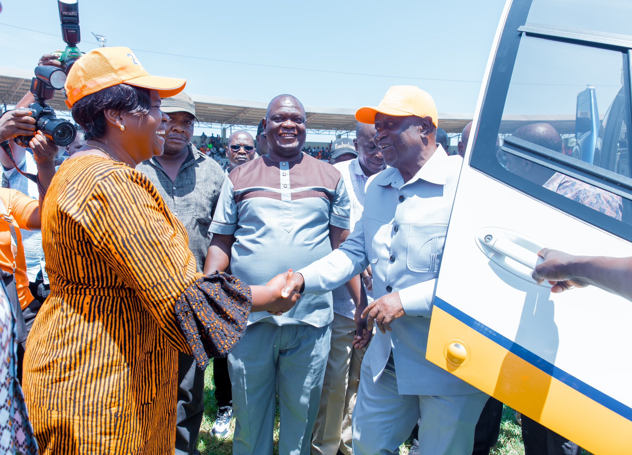 Acting ODM party leader Oburu Odinga is received by Homa Bay Governor Gladys Wanga on arrival at Raila Odinga stadium for the Ecumenical Memorial Service in honour of the late Prime Minister, November 5, 2025. /ODM
