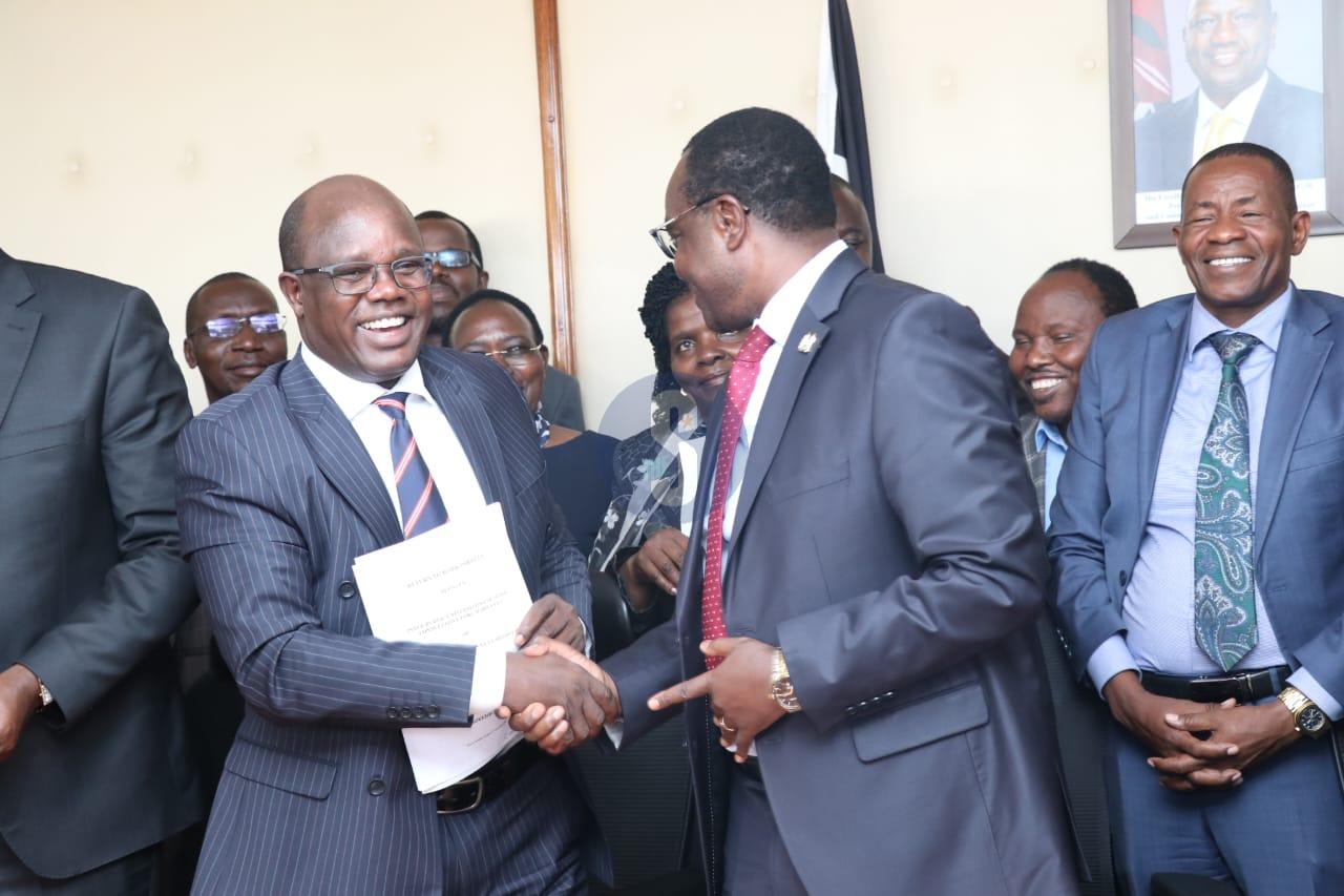 UASU Secretary General Constantine Wasonga shakes hands with Education CS Migos Ogamba after signing a deal to end the 49-day lecturers' strike at Jogoo House, Nairobi, on November 5, 2025./LEAH MUKANGAI