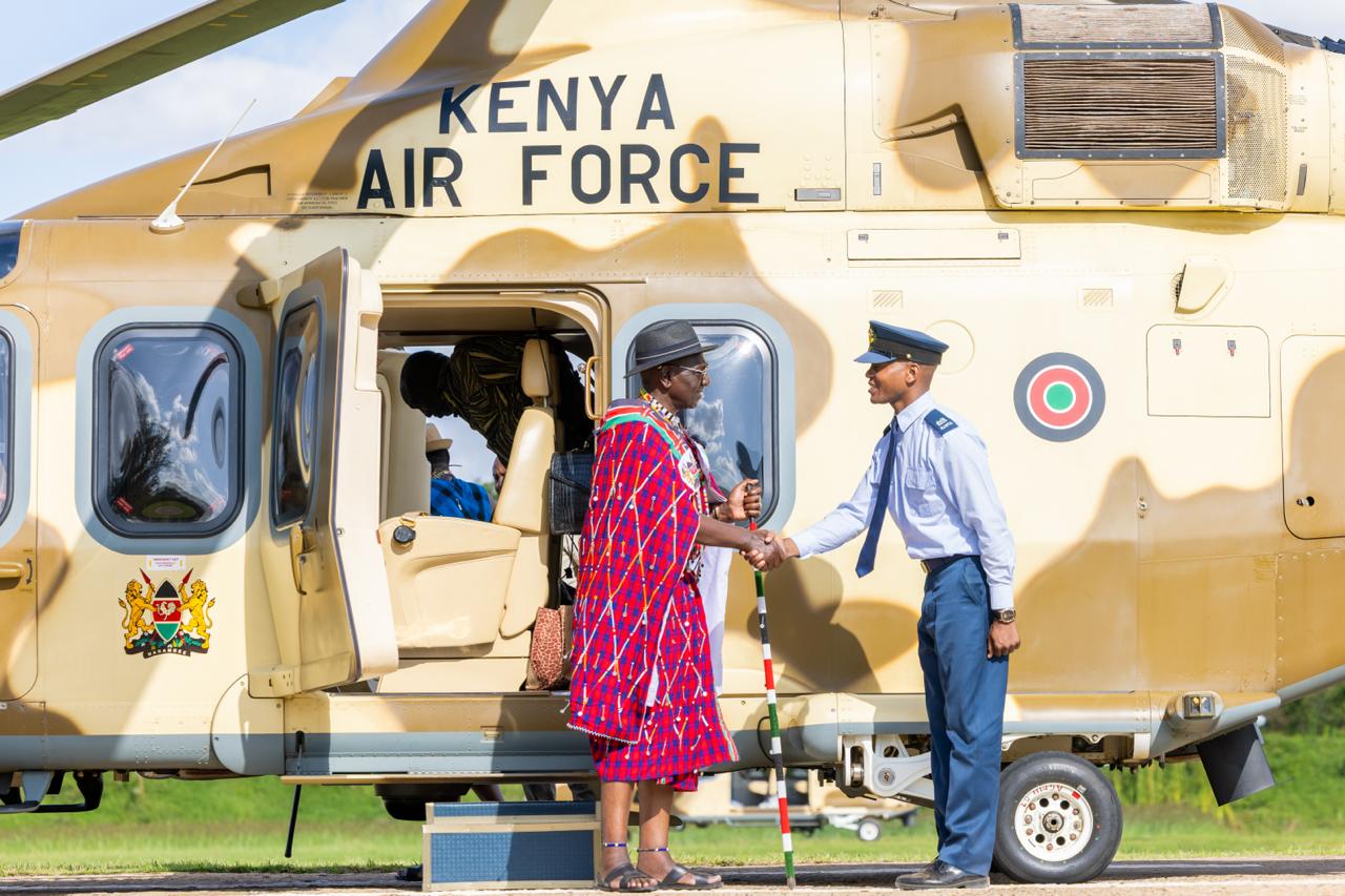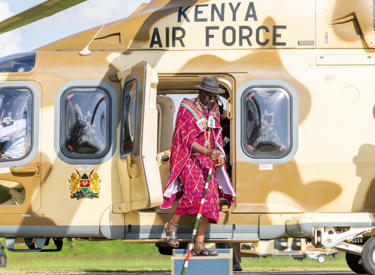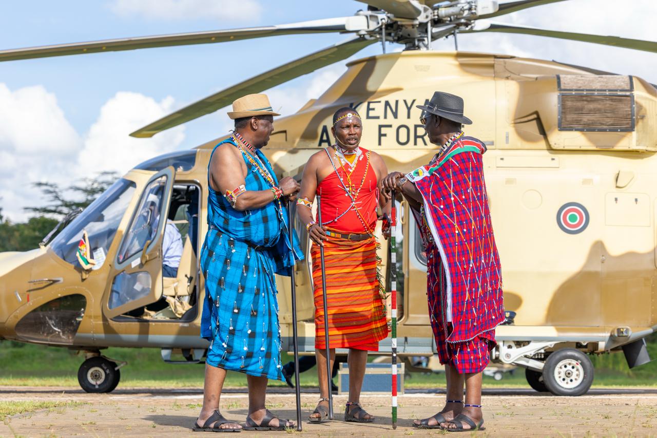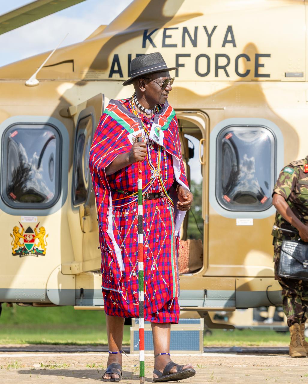 President William Ruto clad in full Maasai regalia after disembarking from a military chopper at State House on November 8, 2025/PCS