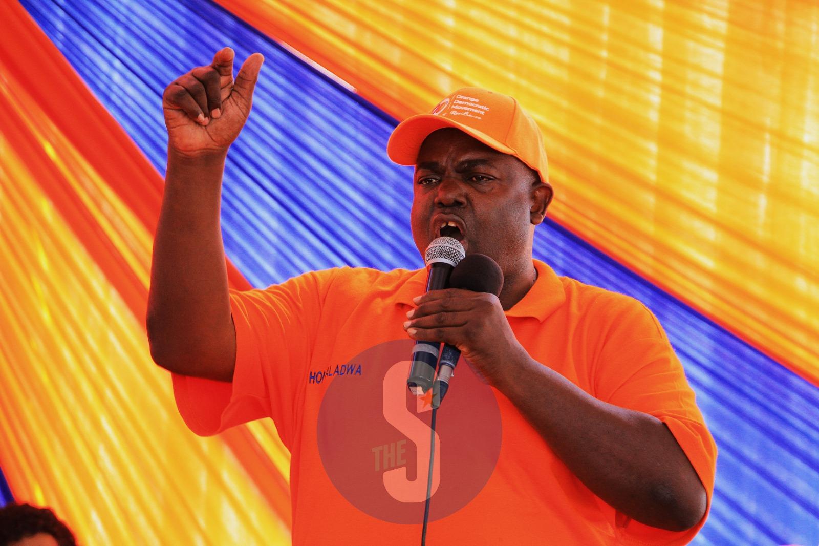 Langata MP Felix Odiwuor Jalang'o addresses the delegates after his donation of One million shillings to ferry supporters to Mombasa celebrations turned chaotic at Pangani sports grounds/EZEKIEL AMING'A