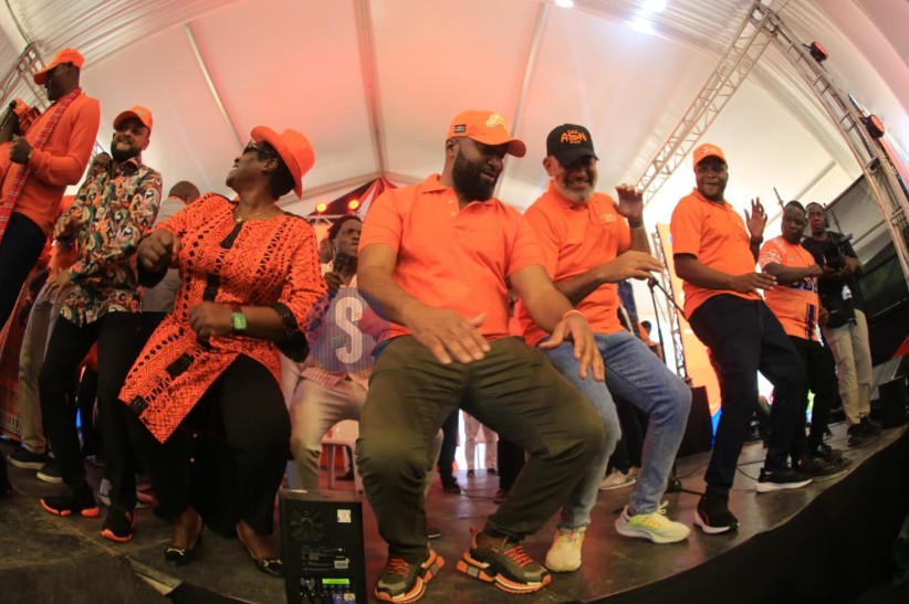 Blue Economy CS Hassan Joho and ODM members dance during ODM@20 celebrations in Mombasa, November 14, 2025. /JOHN CHESOLIThe party is marking the milestone at the Mama Ngina Waterfront from Friday to Sunday to commemorate what it describes as two decades of political service and struggle.