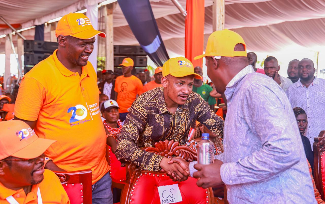 Embakasi East MP Babu Owino greets Treasury CS John Mbadi during ODM's 20th anniversary celebrations at the Mama Ngina Waterfront in Mombasa County, November 15, 2025. /JOHN MBADI/XEmbakasi East MP Babu Owino has urged ODM supporters to remain unwavering in championing the ideals that Raila Odinga stood for, reminding them that loyalty to those principles should define the party’s next chapter.