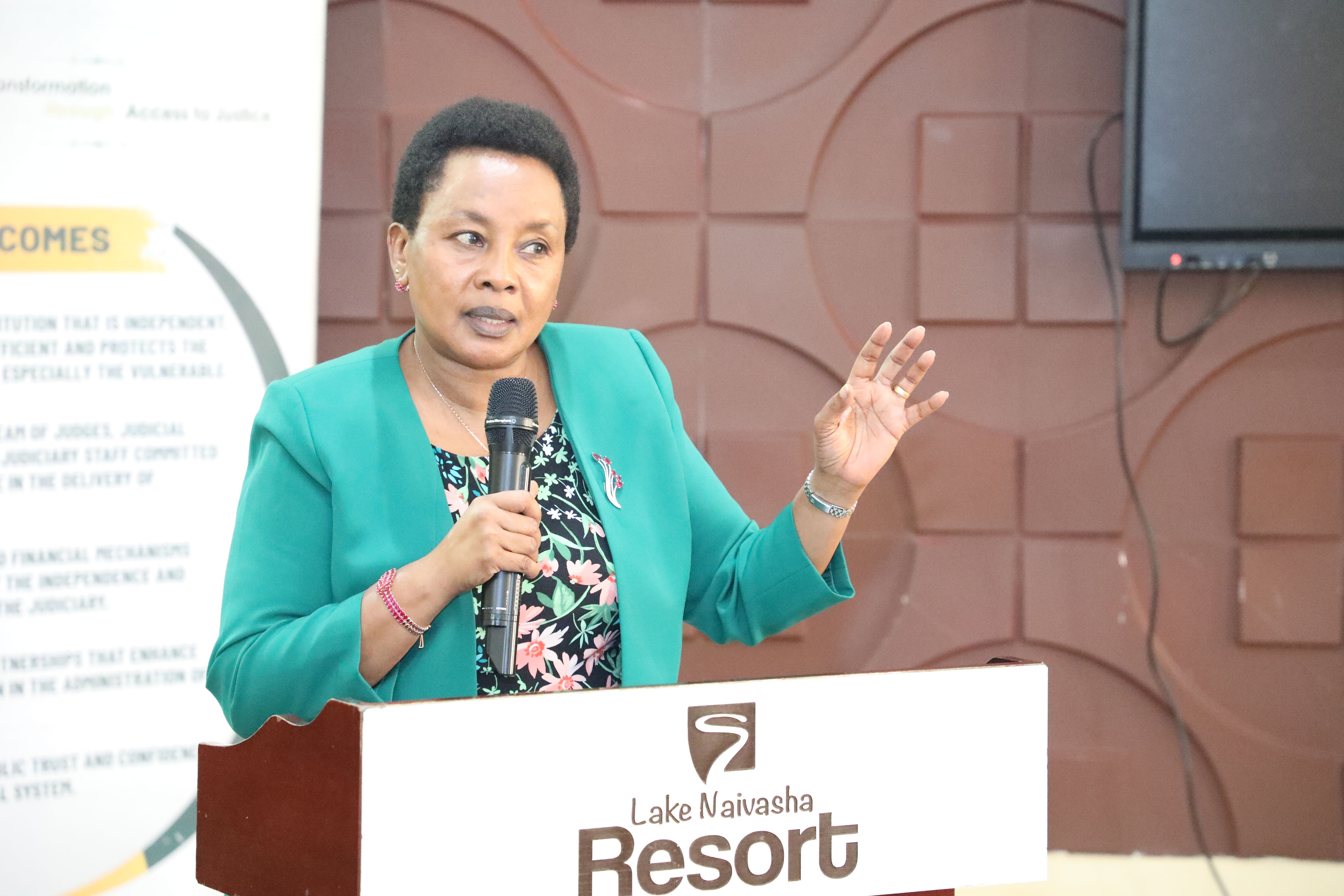 Deputy Chief Justice Philomena Mwilu during the Judiciary Management Team retreat at the Lake Naivasha Resort hotel. /JUDICIARYTurning to the theme of the retreat, ‘STAJ: Assessing Progress and Aligning Priorities,’ the DCJ emphasised that the institutional blueprint must continue guiding administrative thinking and planning.
