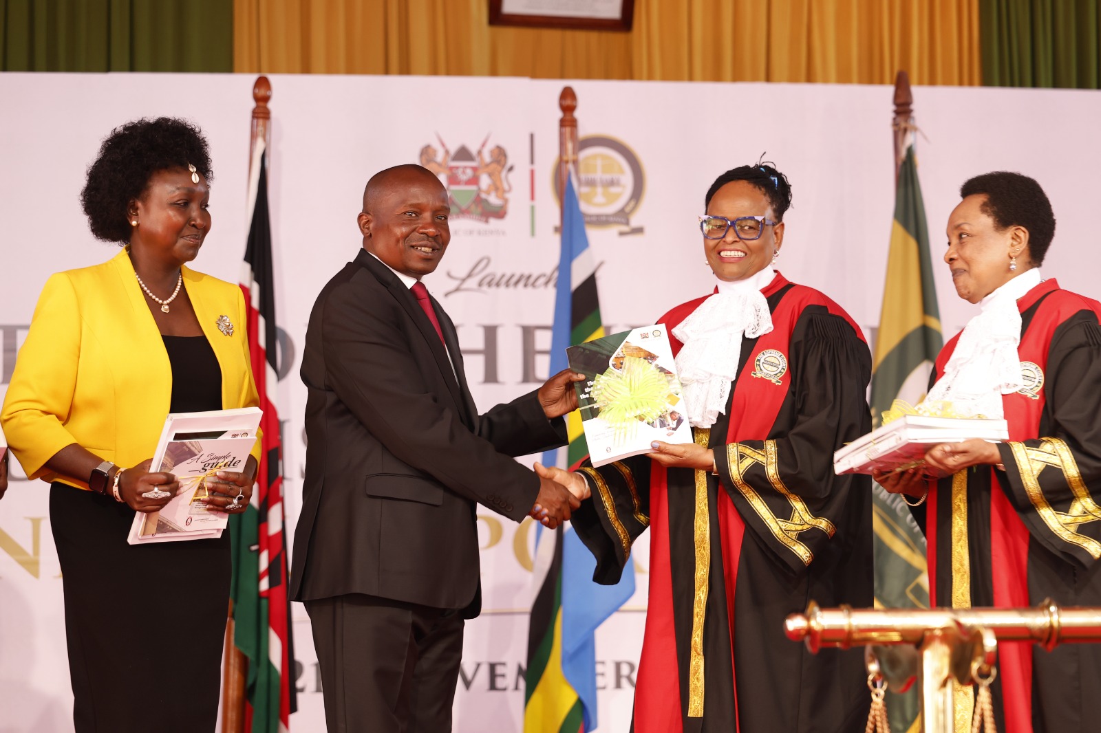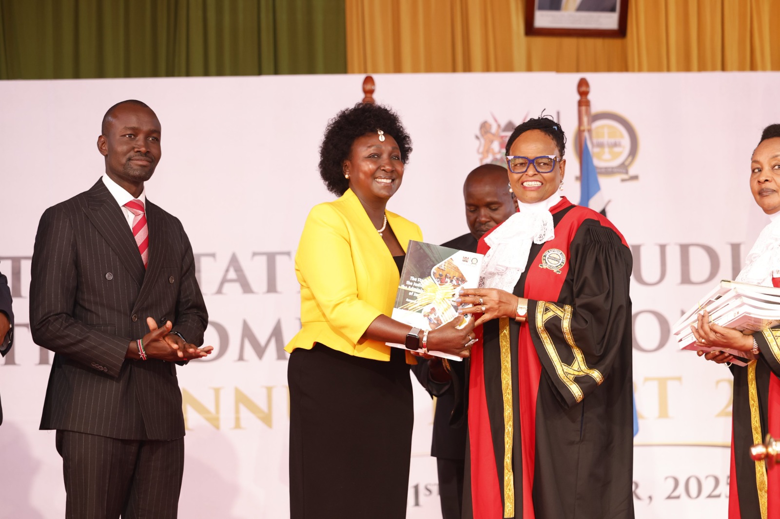Deputy President Kithure Kindiki is handed the State of the Judiciary and the Administration of Justice Report (SOJAR) 2024/2025 by CJ Martha Koome, November 21, 2025.