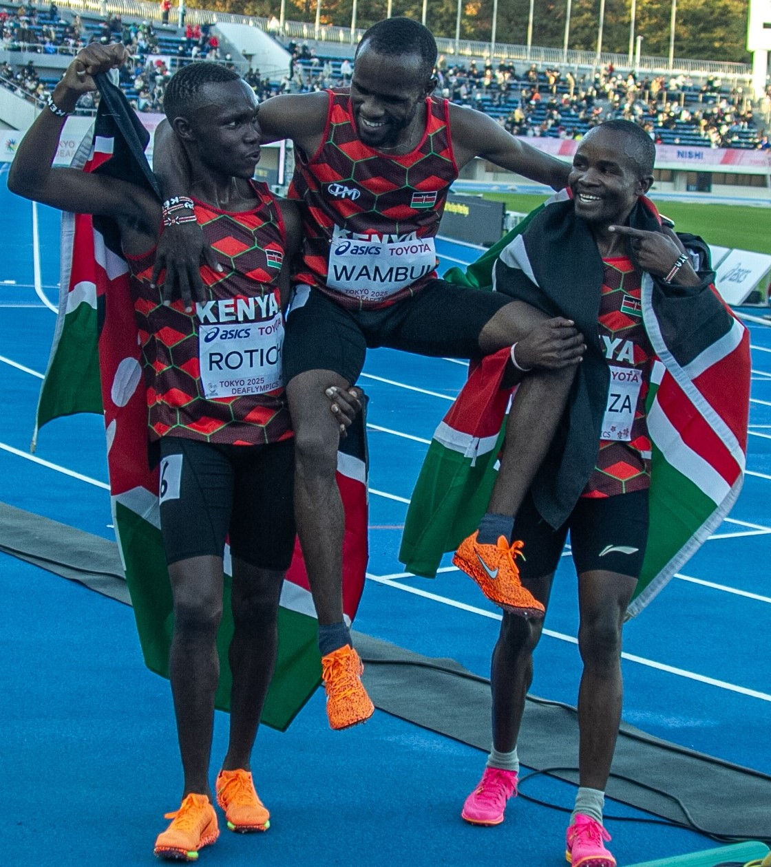 Ian Wambui is carried shoulder high by his compatriots Nelson Rotich and James Musembi after winning gold in the 5, 000m in Tokyo on Monday/KSDFKenya’s dominance at the 2025 Summer Deaflympics reached new heights on Monday after Ian Wambui stormed to his second gold medal, smashing both the world and Games records in a masterful 5,000m performance.