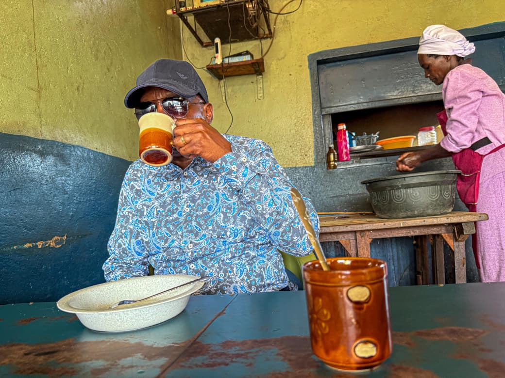 Deputy President Kithure Kindiki sips tea at a local hotel in Mbeere North constituency on November 25, 2025. /DPCSDeputy President Kithure Kindiki has kept his promise and pitched camp in Mbeere North even after the campaigns for the November 27 by-election ended on Monday.
