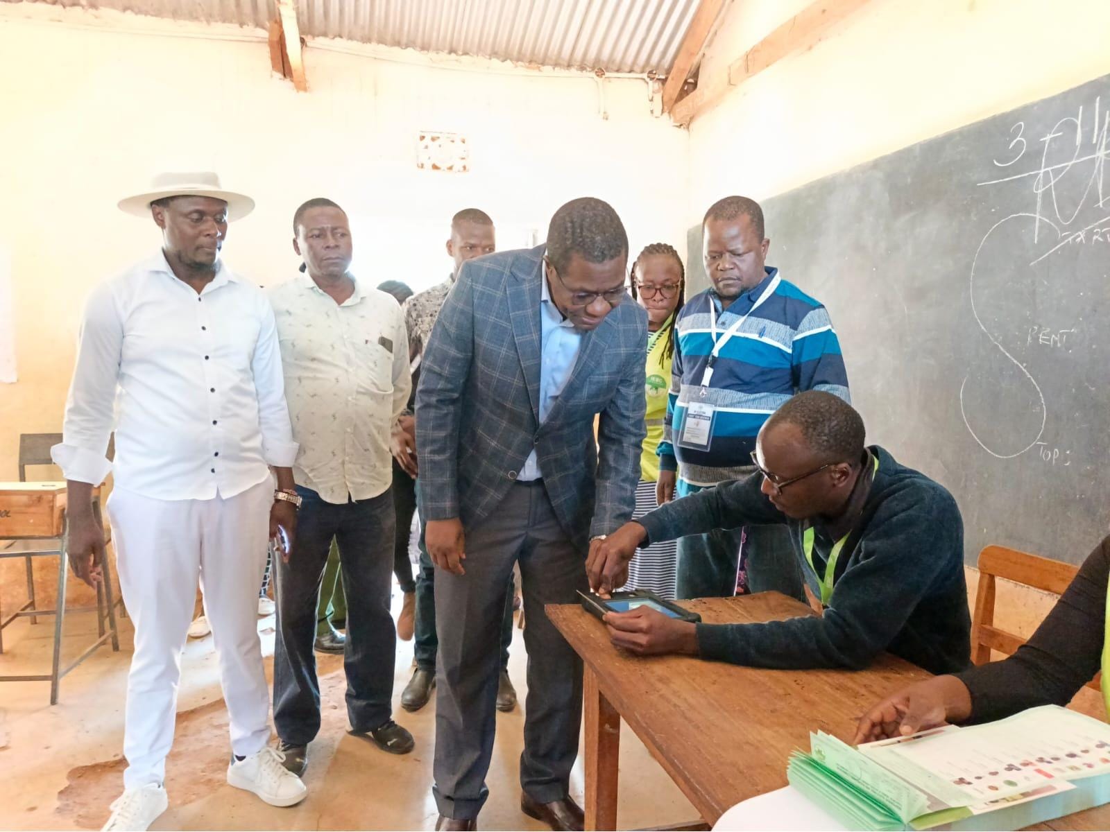 An IEBC official helping CS Wandayi in taking his fingerprints as part of the voting process in Ugunja constituency by elections./Faith Matete