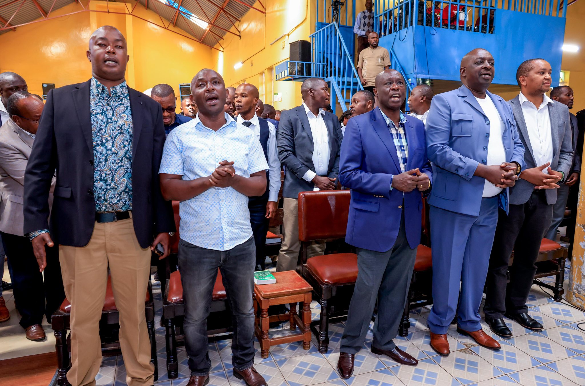 DCP party leader Rigathi Gachagua with other leaders during a Thanksgiving service at P.C.E.A. Kariobangi North Berea Parish Church on November 30, 2025./RIGATHI GACHAGUA