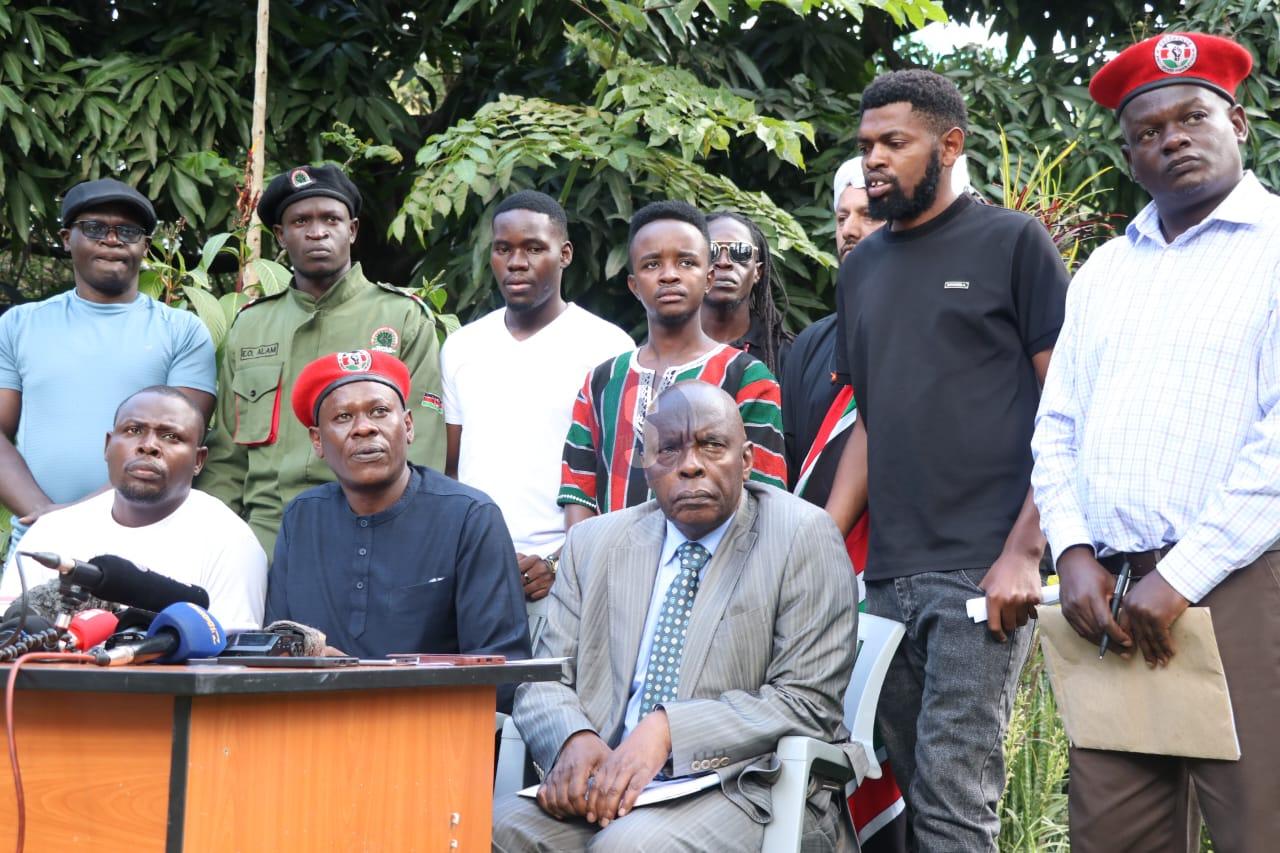 Vocal Africa activist Ojiro Odhiambo, Free Kenya movement president Bob Njagi and former Makueni governor Prof. Kivutha Kibwana lead other activists during a press briefing / LEAH MUKANGAI