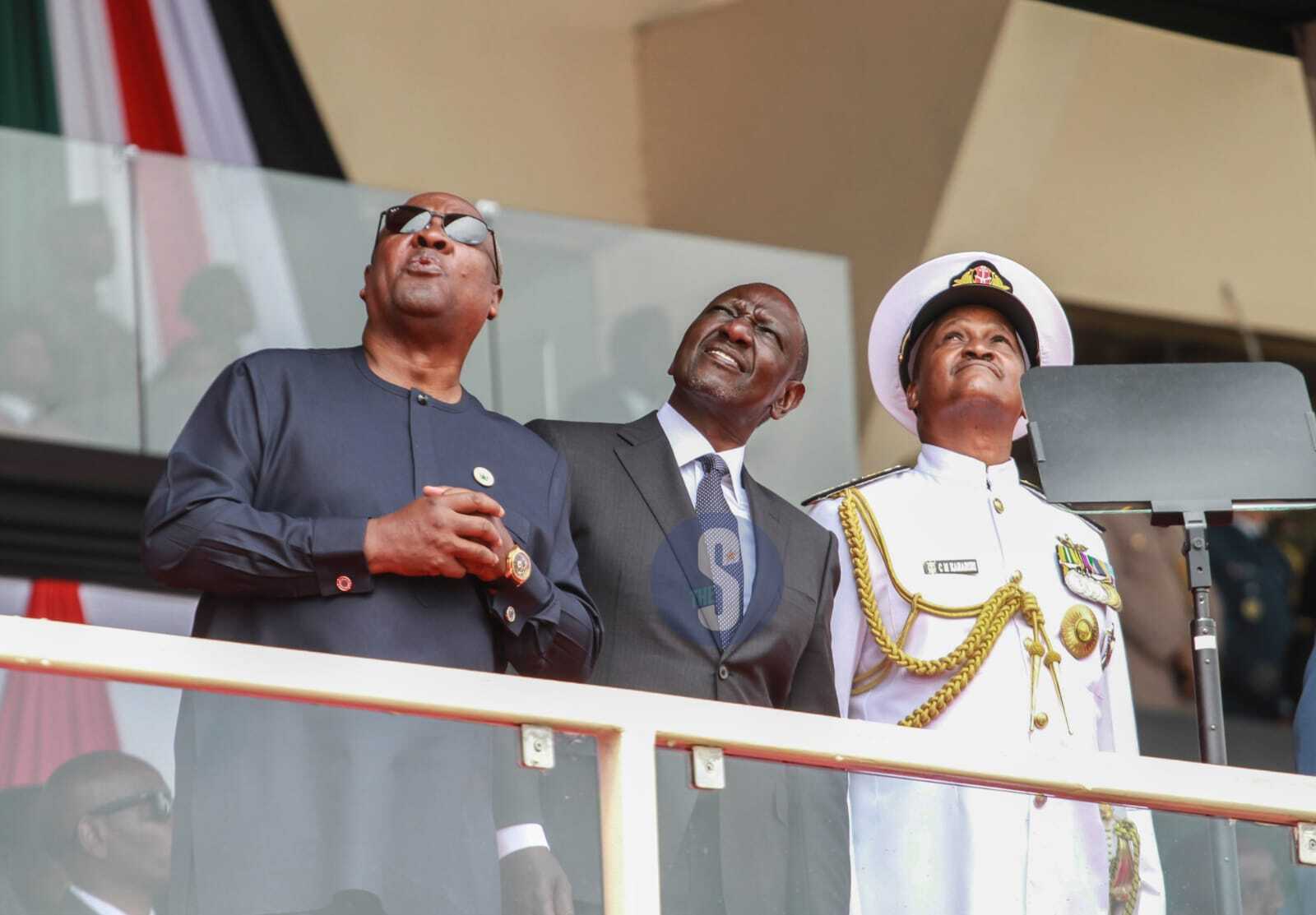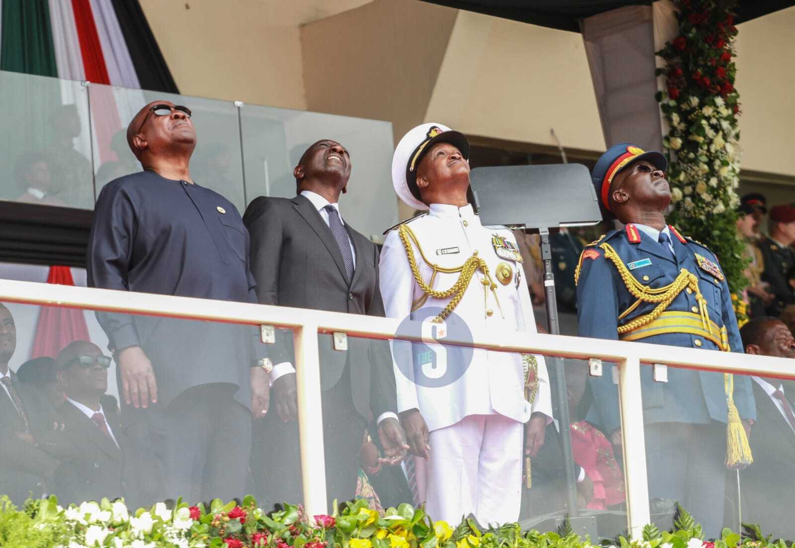 President William Ruto and military chiefs look skywards during a military aircraft display as Kenya marked 62nd Jamhuri Day at Nyayo Stadium, December 12, 2025. /OKUSI TECHEOnce the boom faded, the President and dignitaries broke into appreciative applause, perhaps acknowledging both the skill of the pilot and the unexpected jolt of adrenaline.