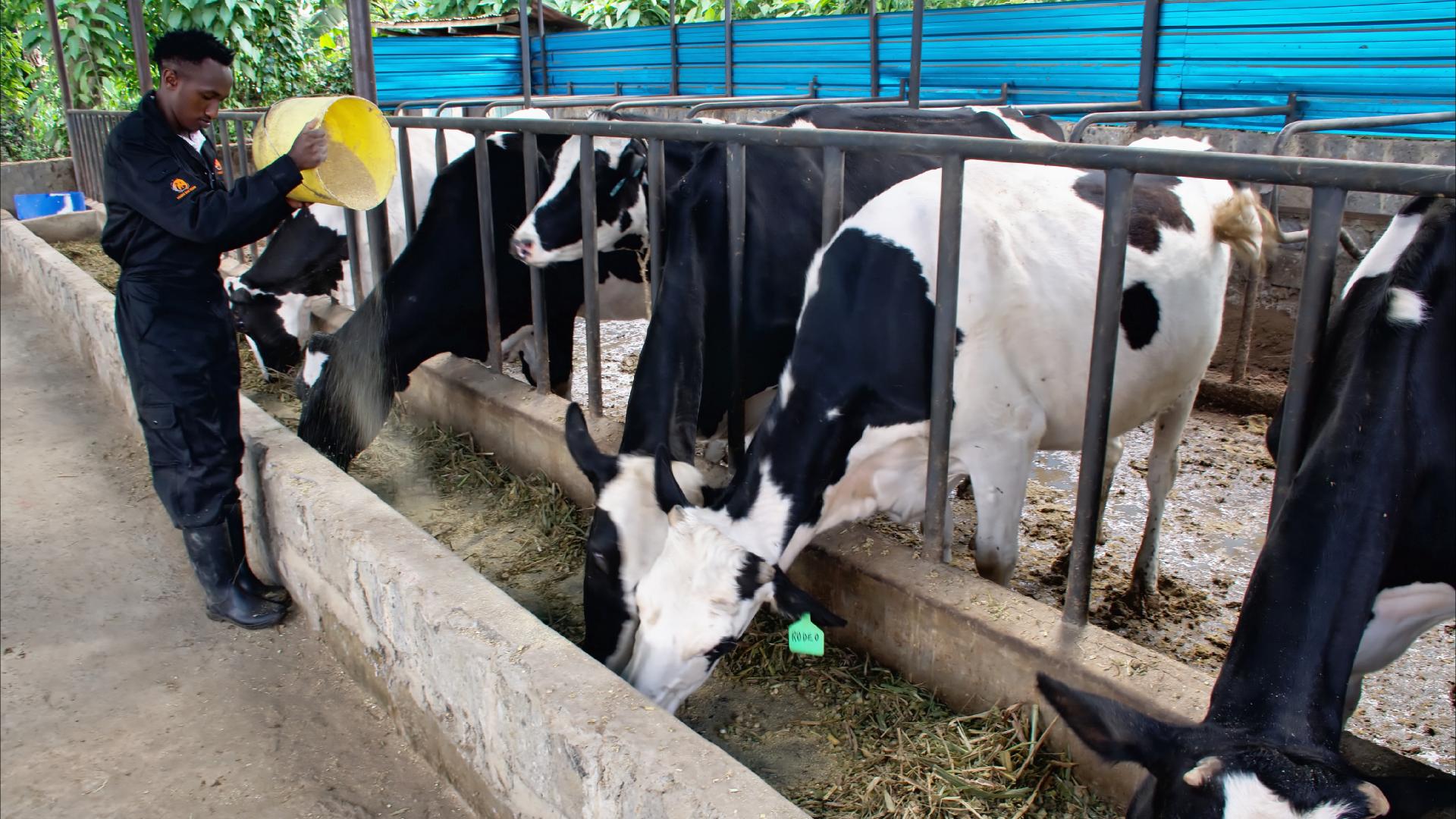 Kelvin Gitau, CEO of Yound Don farm, feeds dairy cows at his farm./AGATHA NGOTHO.
