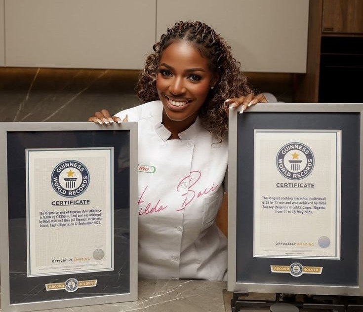 Nigerian celebrity chef Hilda Baci holding two GWR certificates. She earned her second in September 2025 by cooking the world's largest serving of Nigerian-style jollof rice, weighing a staggering 8,780kg/COURTESY