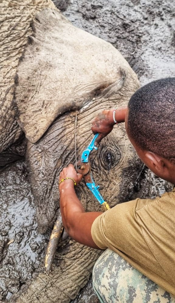 • According to a statement released by the Kenya Wildlife Service, the elephant was found with a snare cutting through her mouth and right ear, posing a serious risk to her health and survival.