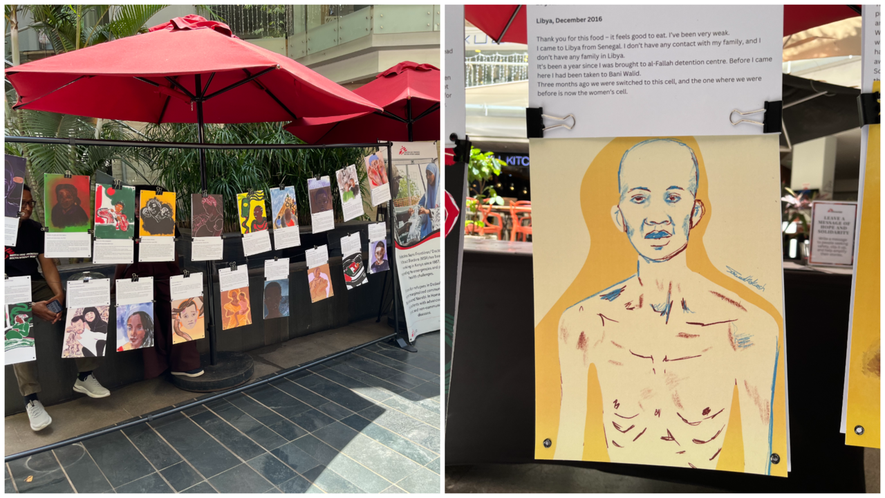 Titled ‘Humans in Transit’, the gallery was set up outdoors in Village Market, a melting pot of expats and tourists. Portraits of 400 survivors, unnamed to protect their identities, were pegged onto lines, with briefs of their ordeals written beneath the illustrations. Most were from West Africa but some came from East Africa and as far as the Middle East. Many were speaking from detention camps in Libya or aboard search and rescue vessels.