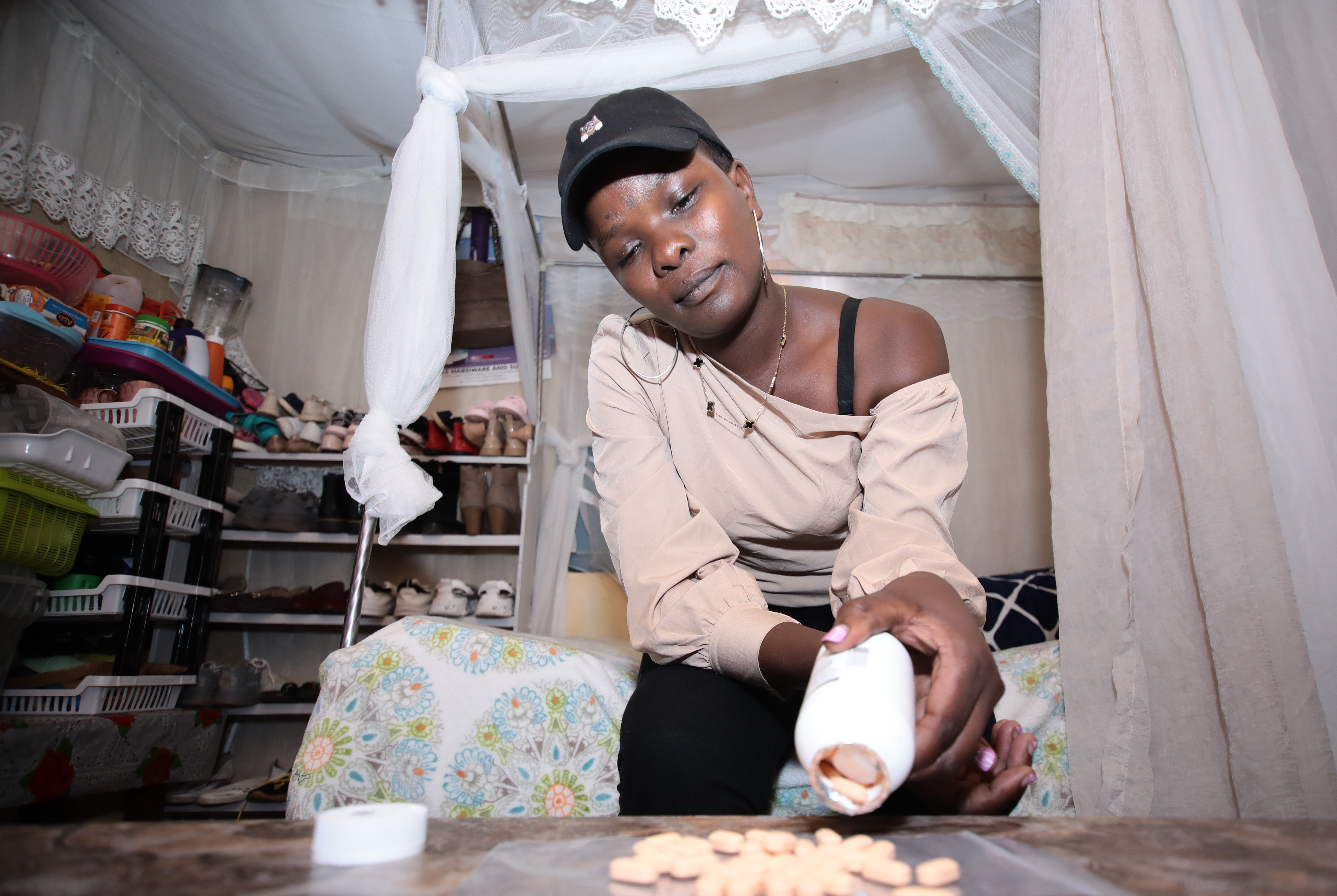 Verah Awuor taking count of her remaining ARV medicine at her home in