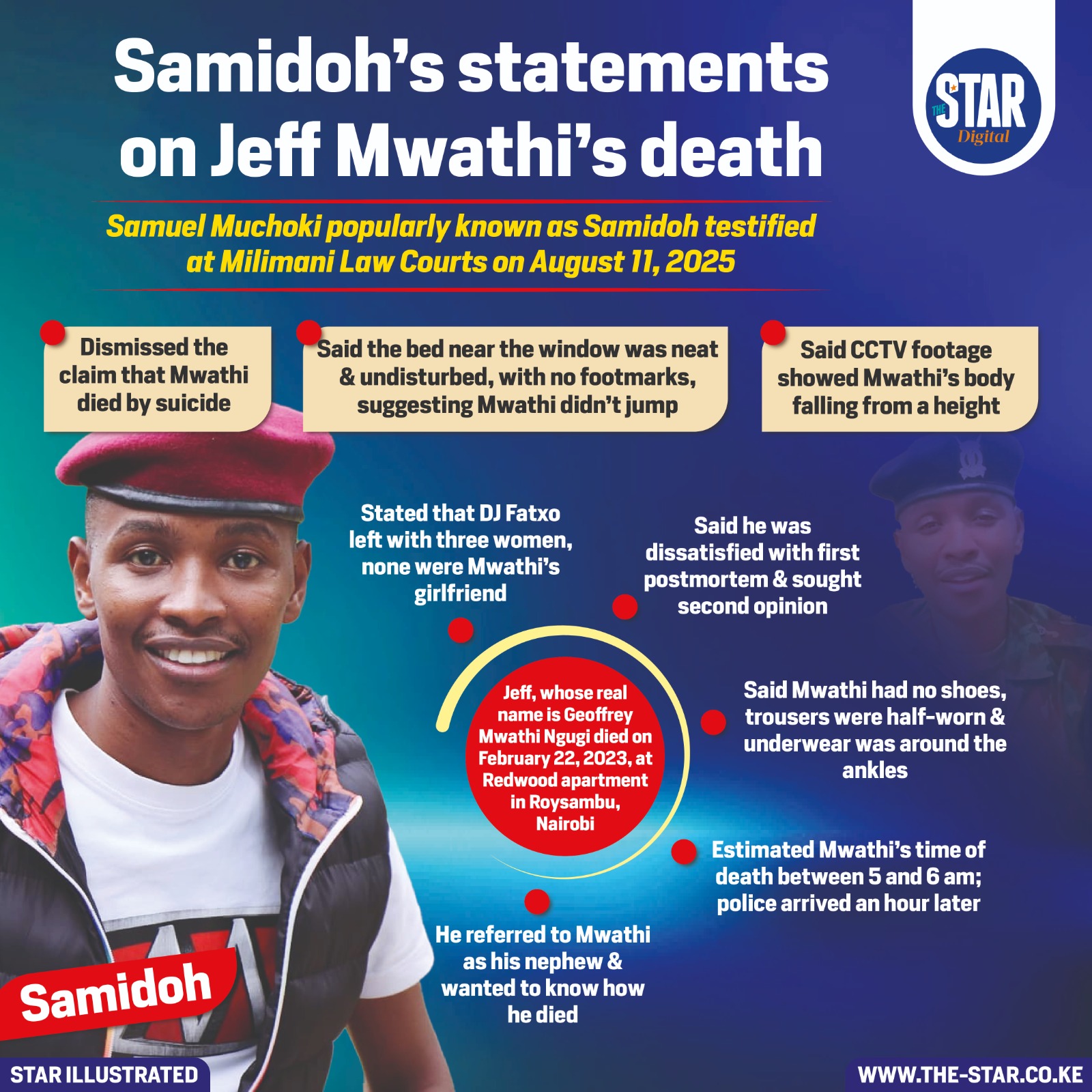 Mugithi singer and police officer Samuel Muchoki, popularly known as Samidoh, on Monday testified in court regarding the ongoing inquest into the death of interior designer Jeff Mwathi.