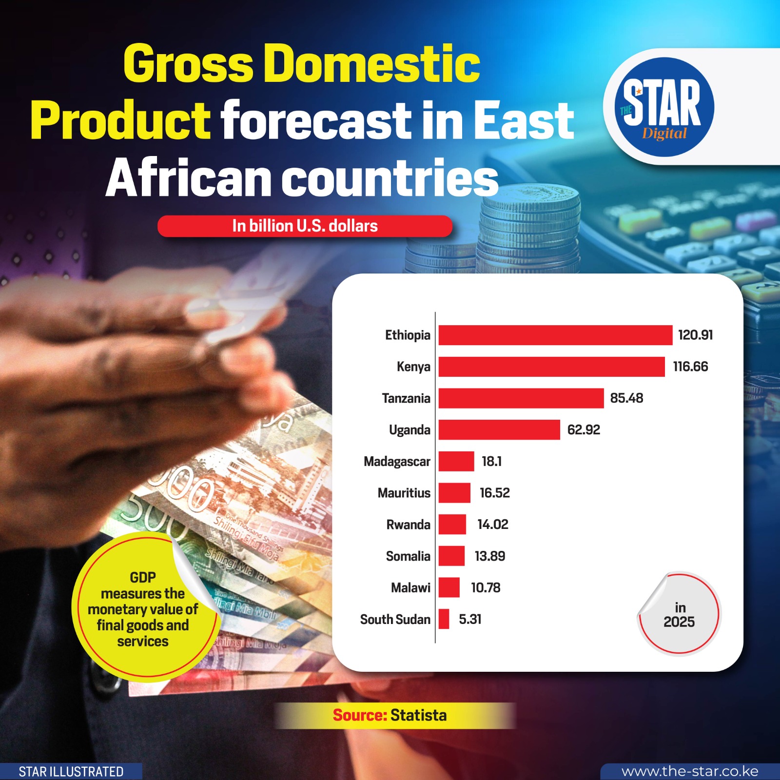 Economic projections for 2025 show Ethiopia and Kenya as the top performers in East Africa, with GDPs of $120.91 billion and $116.66 billion, respectively.